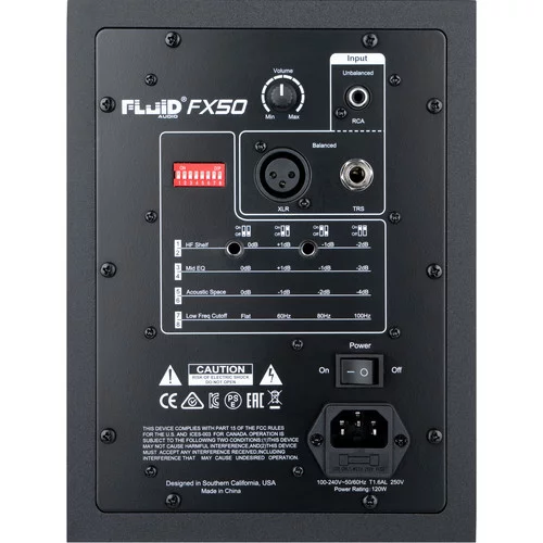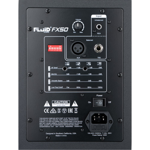 Мониторы Fluid Audio FX50 оборудованы переключателями пресетов эквалайзера, которые позволяют компенсировать особенности помещений, которые «не обработаны» акустически, или снять эффект усиления низа отражением от стены сзади. На задней панели любезно напечатано руководство по применению переключателей с более подробным описанием их работы.