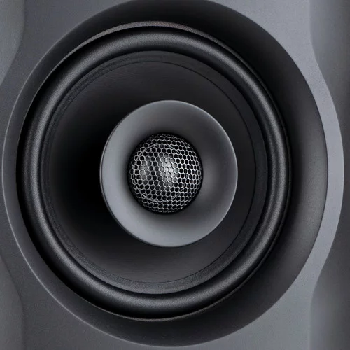 В центре вуфера размещен 25 мм шелковый купольный твиттер в коаксиальной конфигурации. Использование этой технологии (уникально для данной ценовой категории» превращает монитор в «точечный» источник, то есть, весь звук излучается из одной точки, а не из двух, разнесенных на 25 см. Это критически важно для улучшения характеристик вне оси, а также позволяет сделать монитор более компактным.