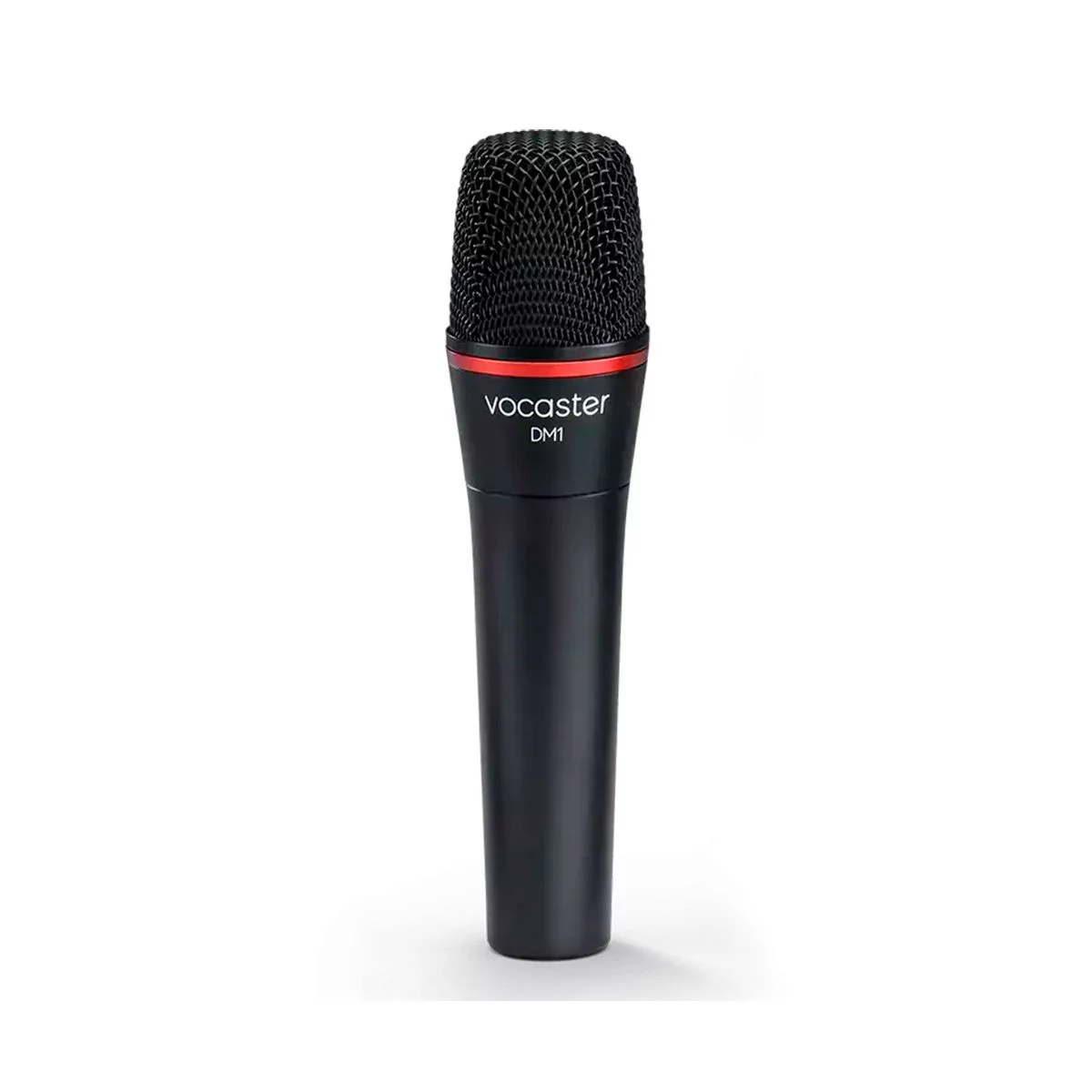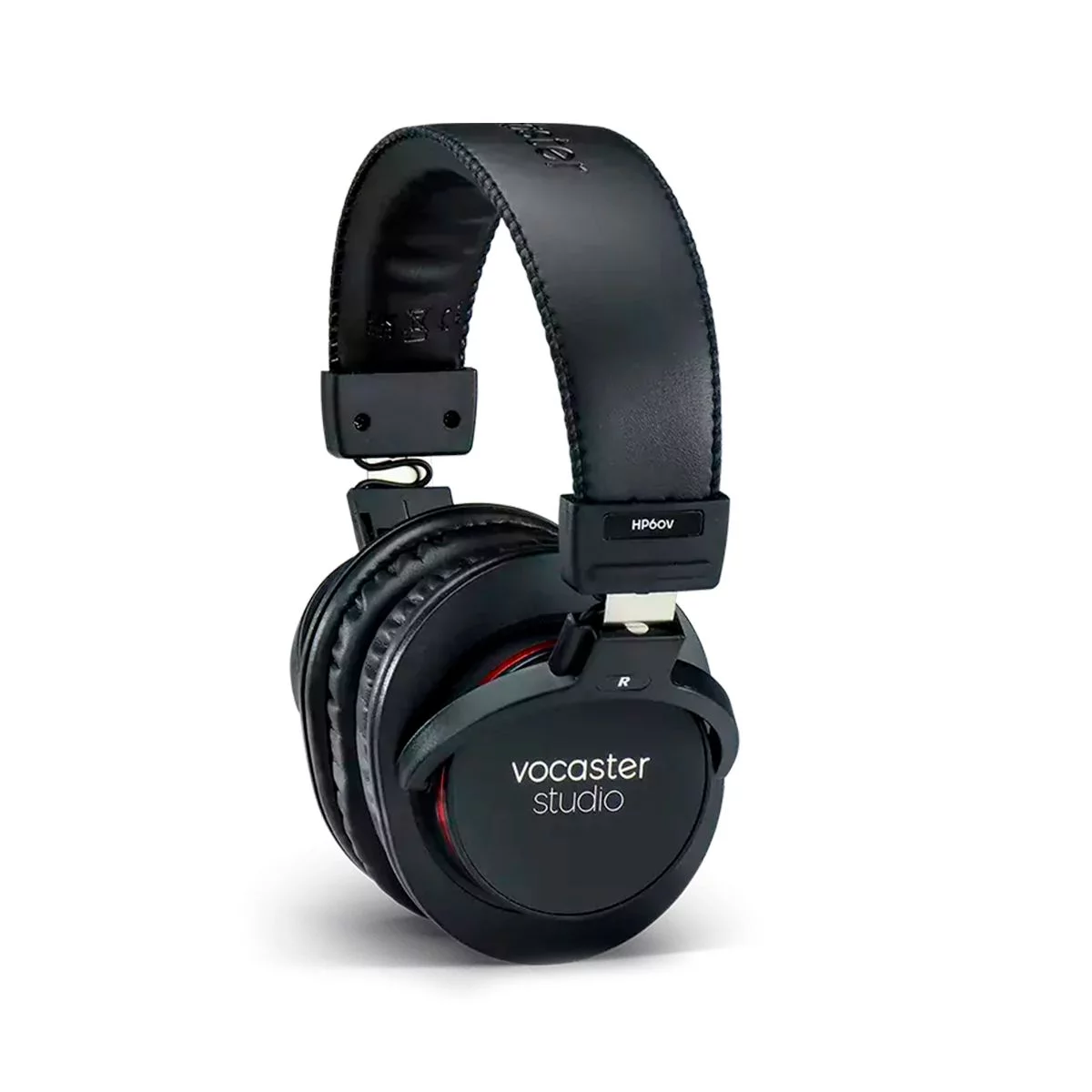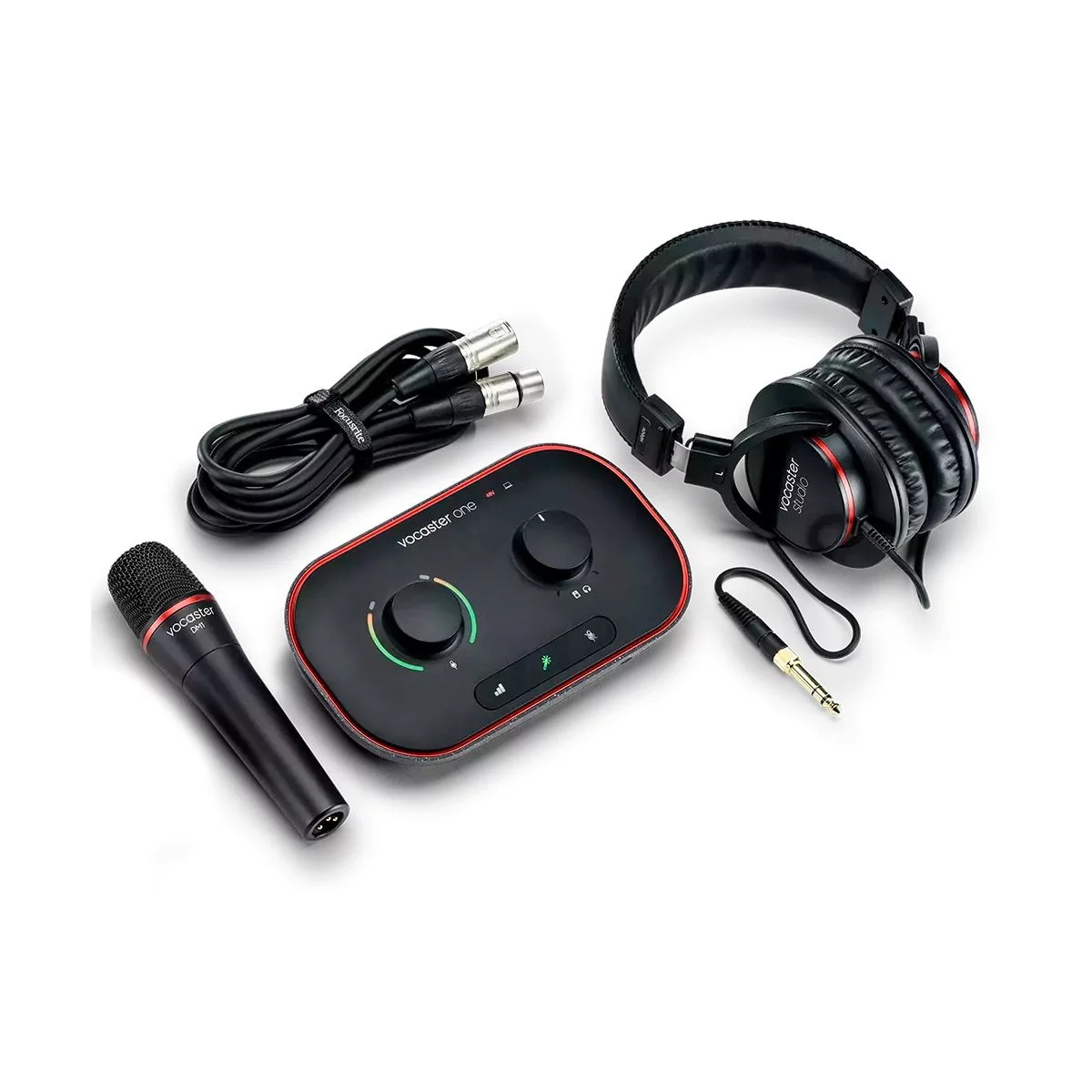 Комплект для домашней студии, включающий USB-аудиоинтерфейс Focusrite Vocaster One, динамический микрофон Vocaster DM1 с креплением на стойку, закрытые мониторные наушники HP60v и микрофонный XLR-кабель. Пре