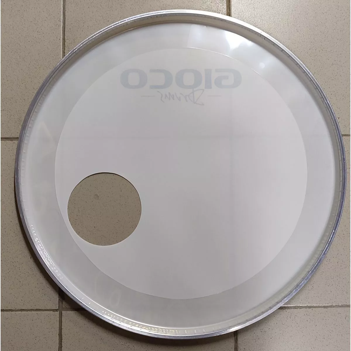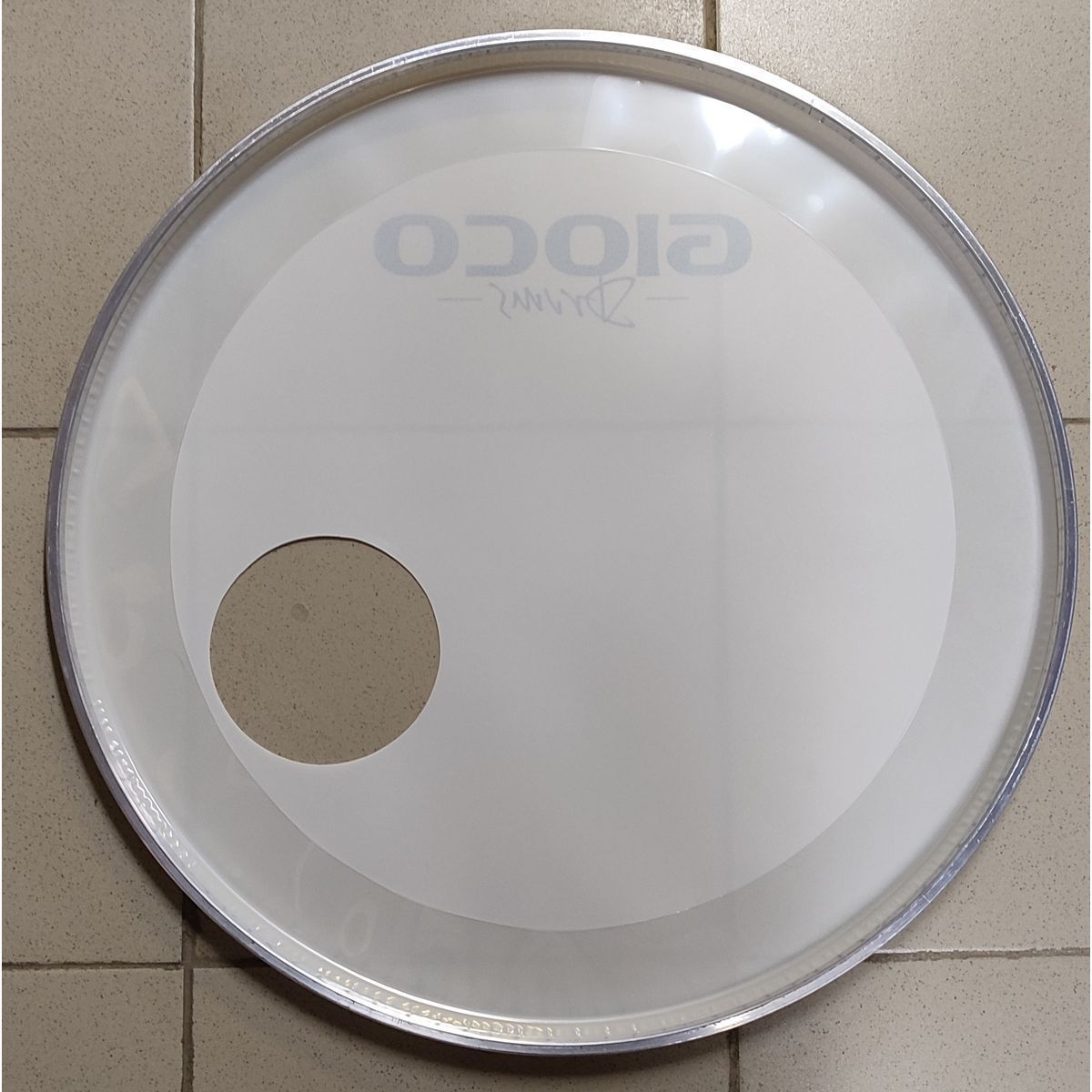Однослойный передний пластик для бас барабана, с напылением, с демпфирующим кольцом, уменьшающим нежелательные обертона, толщина 10 мил*, в том числе для демпфирующего кольца. Отверстие 5".