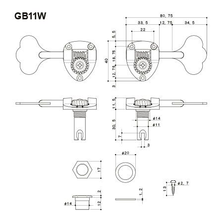 Басовые колки GB-11-W с открытым механизмом повторяют типовую конструкцию и визуальный стиль колков, ставящихся на классический P-bass и J-Bass