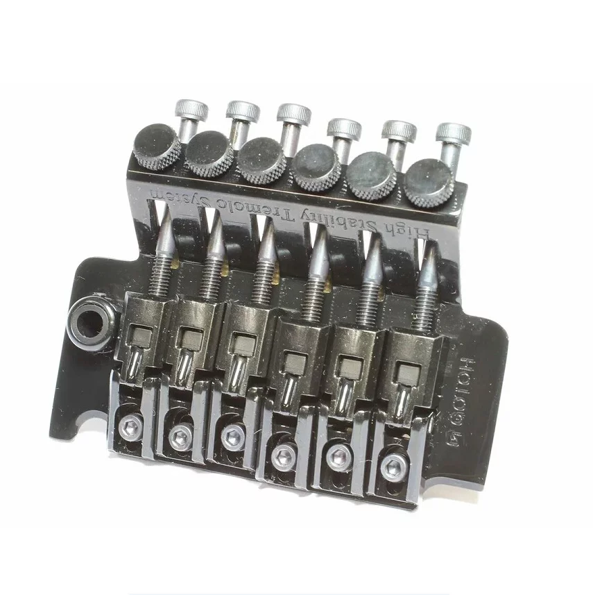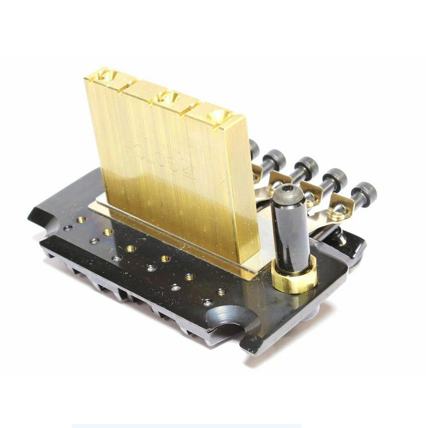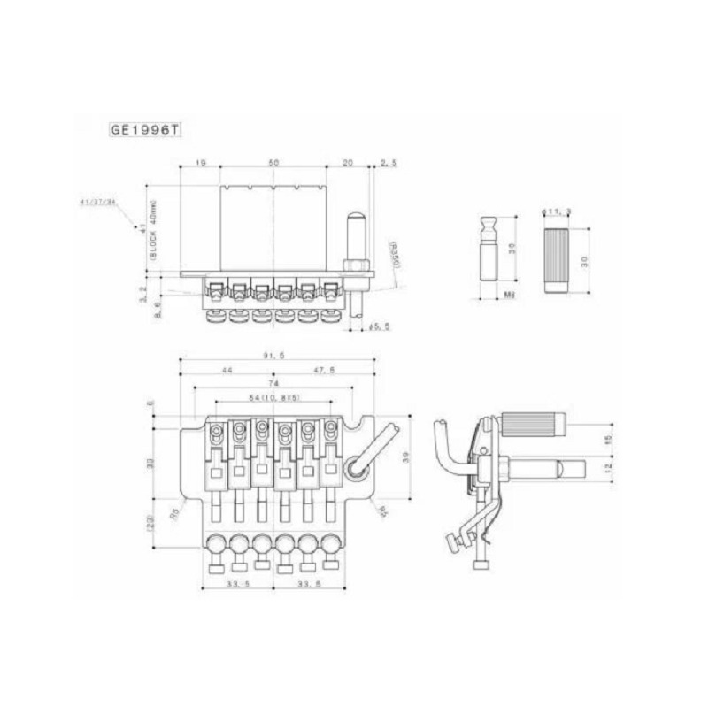 Тремоло GOTOH GE1996T следует классической конструкции – ничего лишнего. Опорные винты вкручиваются в установочные гильзы, что защищает древесину от механических напряжений. Края станины имеют различные профили кромки – у одного она полукруглая, у другого плоская, с открытым углом. Это обеспечивает установку GE1996T на посадочные места, оставшиеся от тремоло других производителей, поскольку у конкретных моделей расстояния между осями разные.