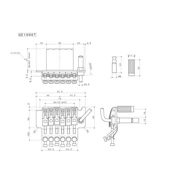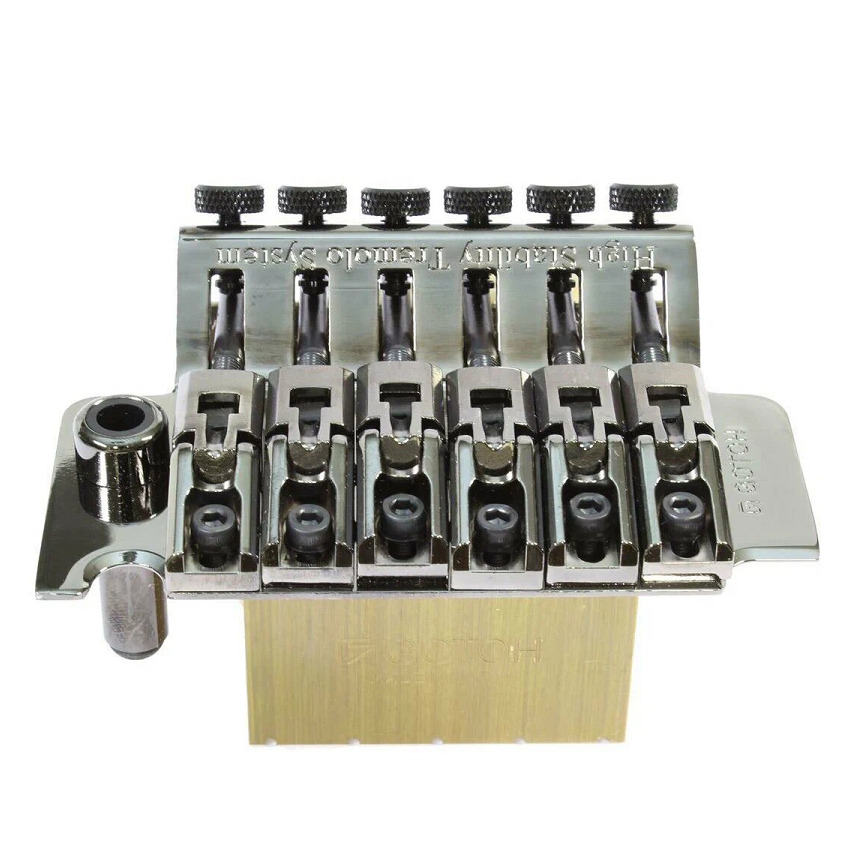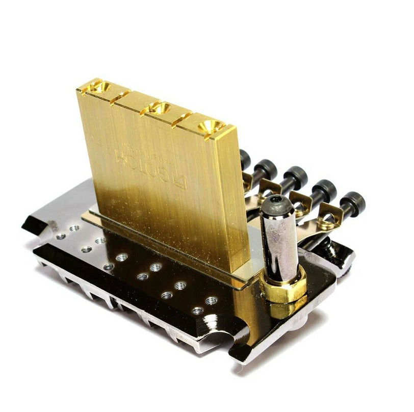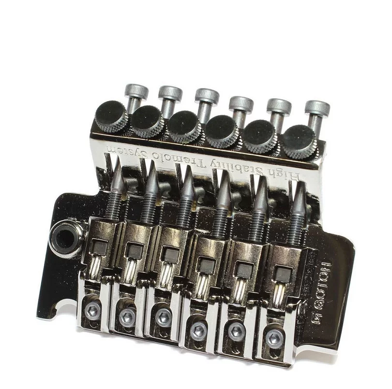 Тремоло GOTOH GE1996T следует классической конструкции – ничего лишнего. Опорные винты вкручиваются в установочные гильзы, что защищает древесину от механических напряжений. Края станины имеют различные профили кромки – у одного она полукруглая, у другого плоская, с открытым углом. Это обеспечивает установку GE1996T на посадочные места, оставшиеся от тремоло других производителей, поскольку у конкретных моделей расстояния между осями разные.