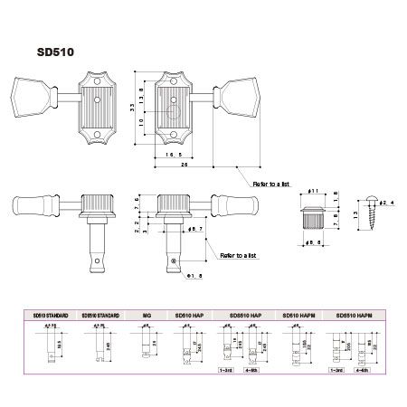 Колки Gotoh серии SD510 с закрытым механизмом в штампованном прямоугльном корпусе с двумя фланцами повторяют стиль винтажных колков, ассоциирующихся в первую очередь с Les Paul (но не только). Точно подорбранные размеры позволяют использовать SD510 для замены оригинальной фурнитуры без какой-либо доработки, в точности на старые посадочные места. При этом, по сравнению с винтажным аналогом, серия SD510 имеет ряд усовершенствований.