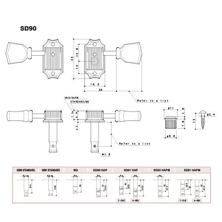 Колки Gotoh серии SD90 с закрытым механизмом в штампованном прямоугльном корпусе с двумя фланцами повторяют стиль винтажных колков, ассоциирующихся в первую очередь с Les Paul (но не только). Точно подорбранные размеры позволяют использовать SD90 для замены оригинальной фурнитуры без какой-либо доработки, в точности на старые посадочные места.
