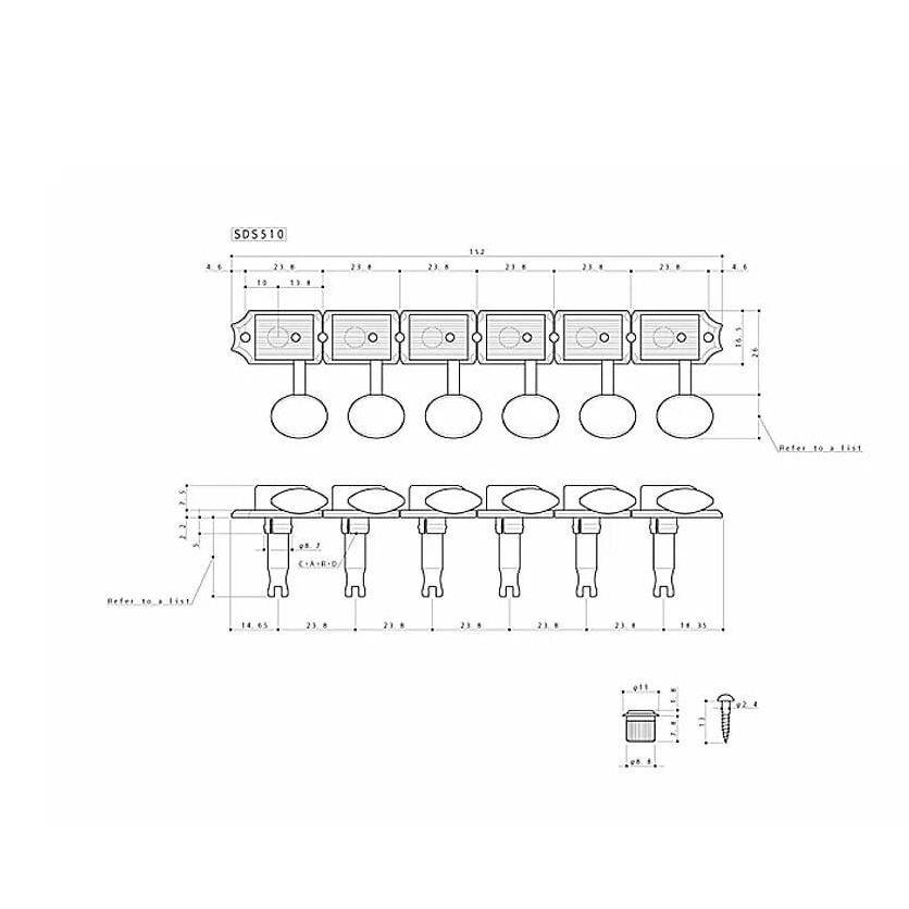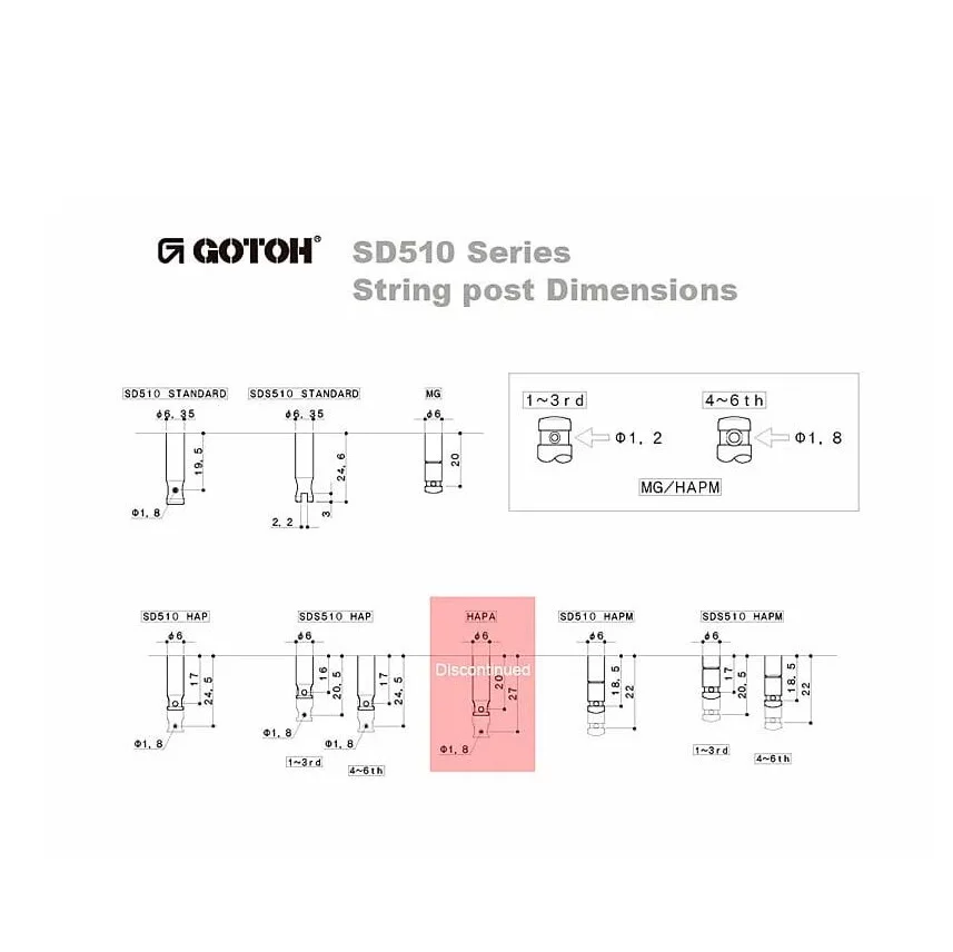 Колки Gotoh серии SD510 с закрытым механизмом в штампованном прямоугольном корпусе с с «купированными ушами» повторяют стиль винтажных колков, ассоциирующихся в первую очередь с Les Paul (но не только). Точно подобранные размеры позволяют использовать SD510 для замены оригинальной фурнитуры без какой-либо доработки, в точности на старые посадочные места. При этом, по сравнению с винтажным аналогом, серия SD510 имеет ряд усовершенствований.