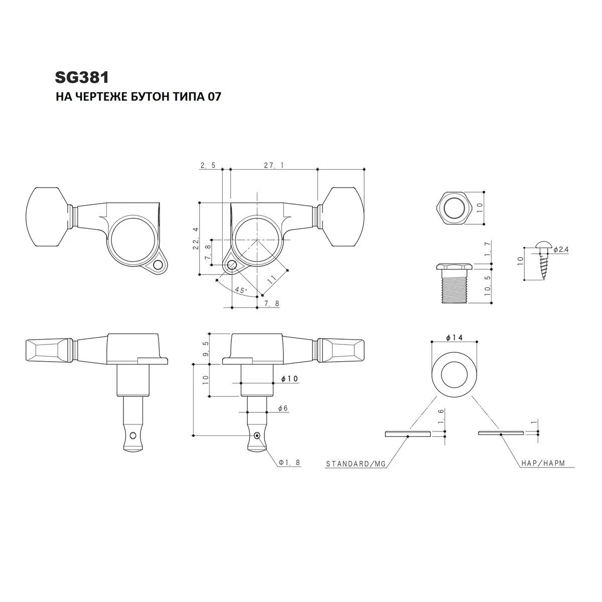 Серия колков SG381 выполнена в самом, пожалуй, популярном современном формате герметичных (sealed) колков c одним угловым фланцем. Колки такого формата широко применяются производителями, как на электрогитарах, так и на акустических инструментах, и колки SG381 обычно встают на фабричные посадочные места, как «родные».