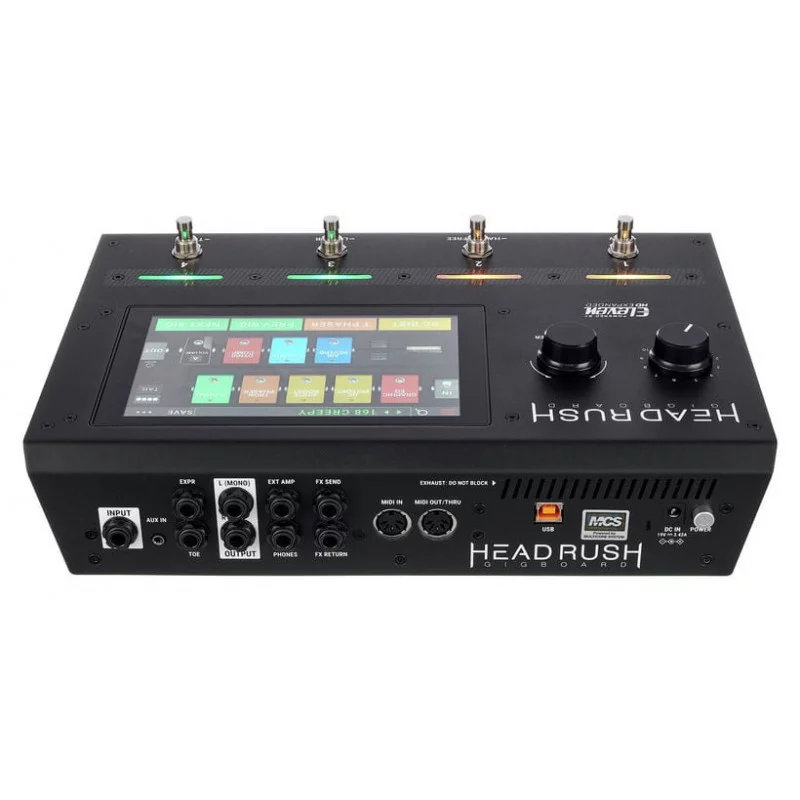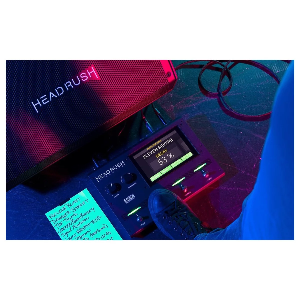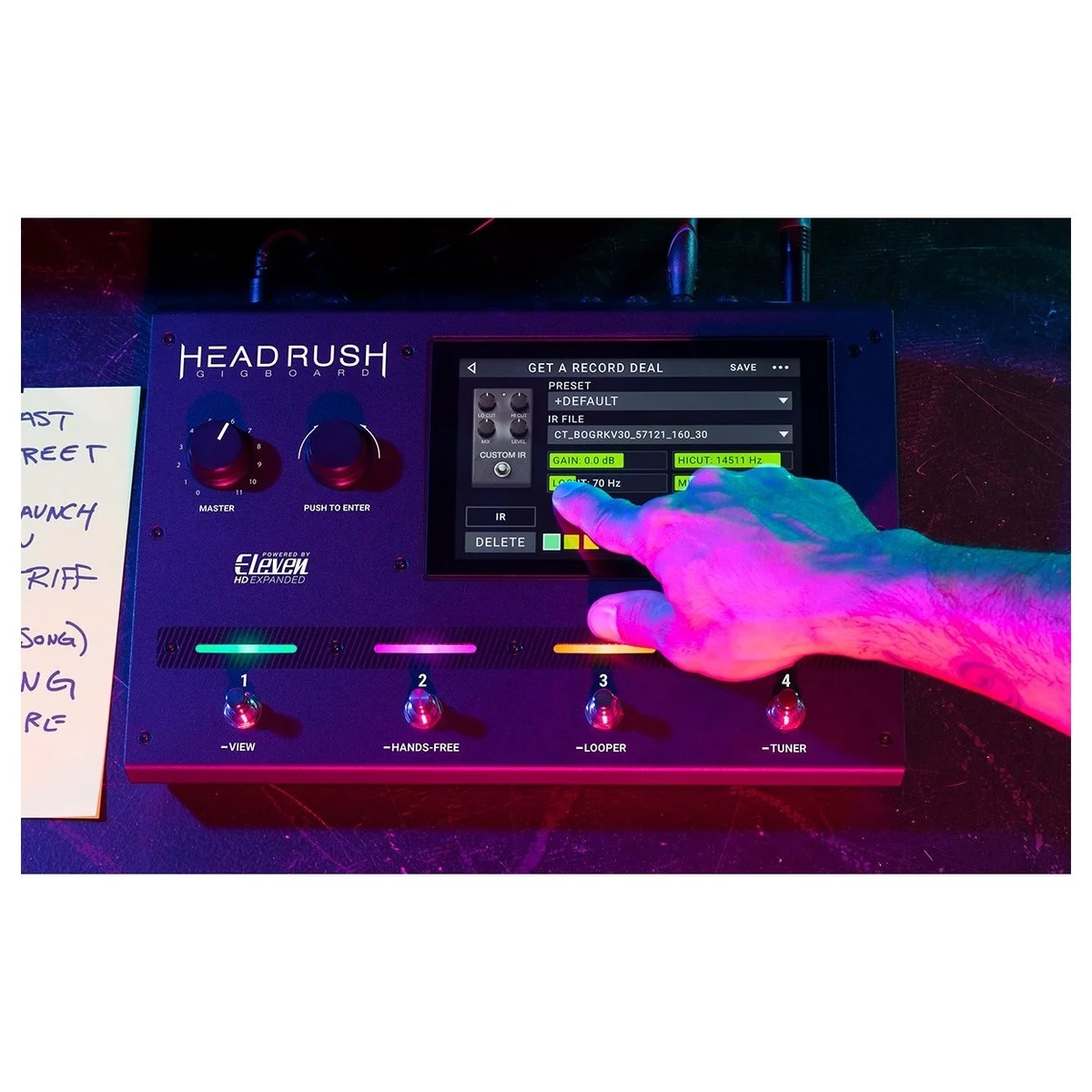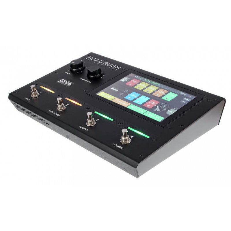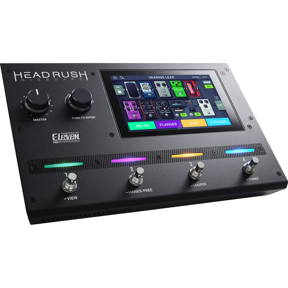 HEADRUSH GIGBOARD - это профессиональный напольный процессор эффектов. Процессор имеет четырехядерный процессор и эксклюзивное ПО ElevenHD Expaned DSP. ГИтаристам доступен богатый выбор из 34 моделей усилителей, 15 моделей кабинетов, 10 микрофонов и 48 видов эффектов - 6 овердрайв/дисторшн, 5 эквалайзеров, 7 модуляций, 7 эффектов реверб/дилэй, 5 режимов работы педали экспрессии. Кроме этого, есть 4 ножных переключателя эффектов, педаль экспрессии и яркий сенсорный экран 7". Дисплей сенсорный, что значительно упрощает быструю настройку звучания.  Процессор эффектов HeadRush Pedalboard представляет реалистичный и гибкий в настройках звук лучших кабинетов усилителей, микрофонов и эффектов. Есть интегрированный лупер с записью до 20 минут. Благодаря гибким настройкам звучания, гитарсты смогут настроить практически любой звук, от самого легкого, до запредельно тяжелого метал-саунда. Корпус процессора сделан из стали, кнопки подсвечены, что позволяет легко пользоваться устройством даже в полной темноте на сцене. Размеры процессора 60,96 х 30,48 х 7,92 см, вес - 7,5 кг. Адаптер питания в комплекте поставки.