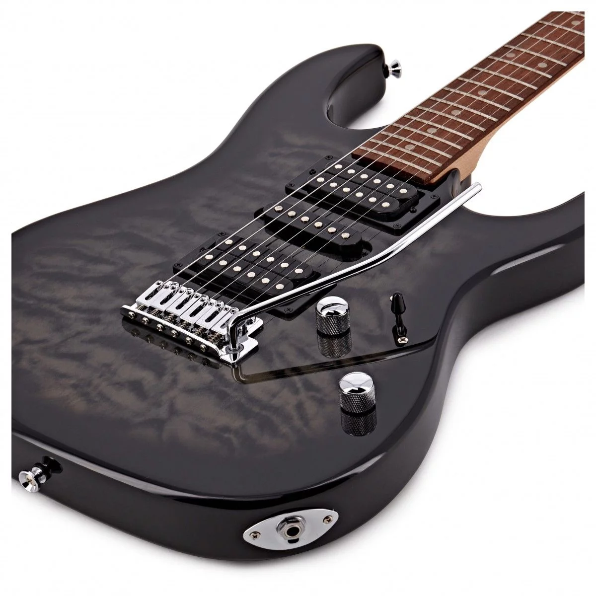 Электрогитара Ibanez GRX70QA-TKS имеет крепкий корпус из тополя с топом из узорчатого клёна, кленовый гриф радиусом 15,74 дюйма с накладкой из палисандра, 24 лада, обеспечивающие четыре полные октавы, звукосниматели Standard BH/MS/NH с пятипозиционным переключателем режимов работы, ручки общей громкости и тона - всё что нужно для начала занятий. Также стоит заметить, что топ из узорчатого клена в совокупности с сочным красным покрытием, создают поистине уникальный по своей красоте инструмент. Учитывая прекрасную эргономику, позволяющую репетировать часами, и качественную, хотя и бюджетную, электронику, вкупе с привлекательным внешним видом, вы можете считать, что уже нашли свой первый инструмент, который поведёт вас к вершинам гитарного мастерства.