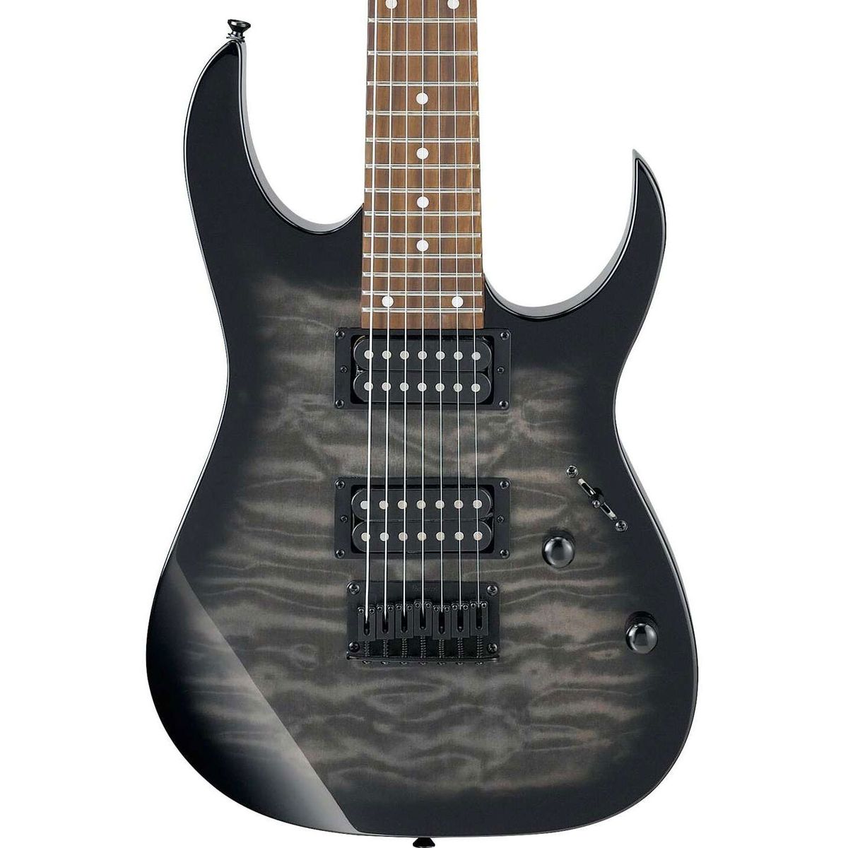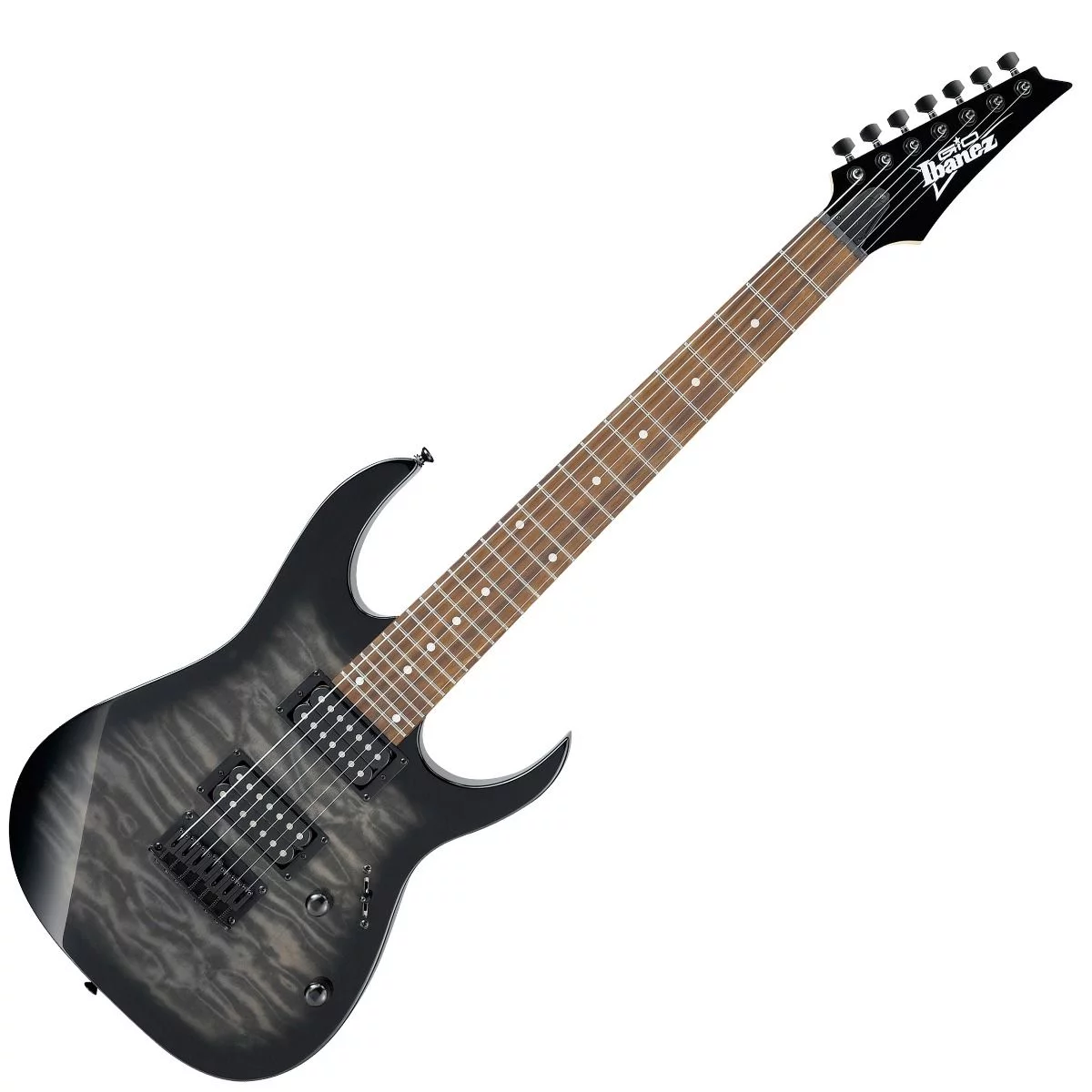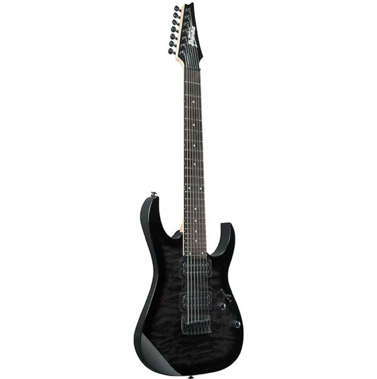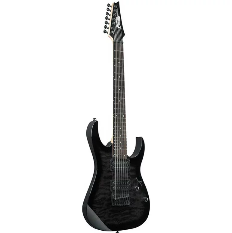 IBANEZ GRG7221QA-TKS – семиструнная электрогитара из самой узнаваемой линейки знаменитого японского производителя RG. Этот инструмент может похвастаться хорошим качеством материалов и отличным звуком, несравнимыми с другими инструментами такой же ценовой категории, наглядно доказывая, что гитара с хорошим звучанием вовсе не обязательно должна дорого стоить. Серия RG GIO была специально разработана для начинающих гитаристов, которые хотят получить качественный инструмент по демократичной цене. Представленная модель прошла точно такую же тщательную проверку качества материалов и сборки, как и более дорогие инструменты линейки. Лёгкая изящная дека сделана из древесины тополя с эффектным топом из волнистого клена. Гриф гитары профиля GRG7 – кленовый. Накладка на гриф – из специальным образом обработанной новозеландской сосны. На грифе 24 лада Jumbo с инкрустацией белыми точками. За звук инструмента отвечают два хамбакера Infinity R. Звукосниматели пассивные, открытого типа, черного цвета, с керамическими магнитами. Переключатель – 5-позиционный. Элементы управления лаконичны: громкость и тембр. Бридж – фиксированный Ibanez F107. Модель представлена в элегантном серо-черном цвете «Transparent Black Sunburst», выгодно демонстрирующем красивую фактуру кленового топа, с черной головой грифа, хромированной фурнитурой.