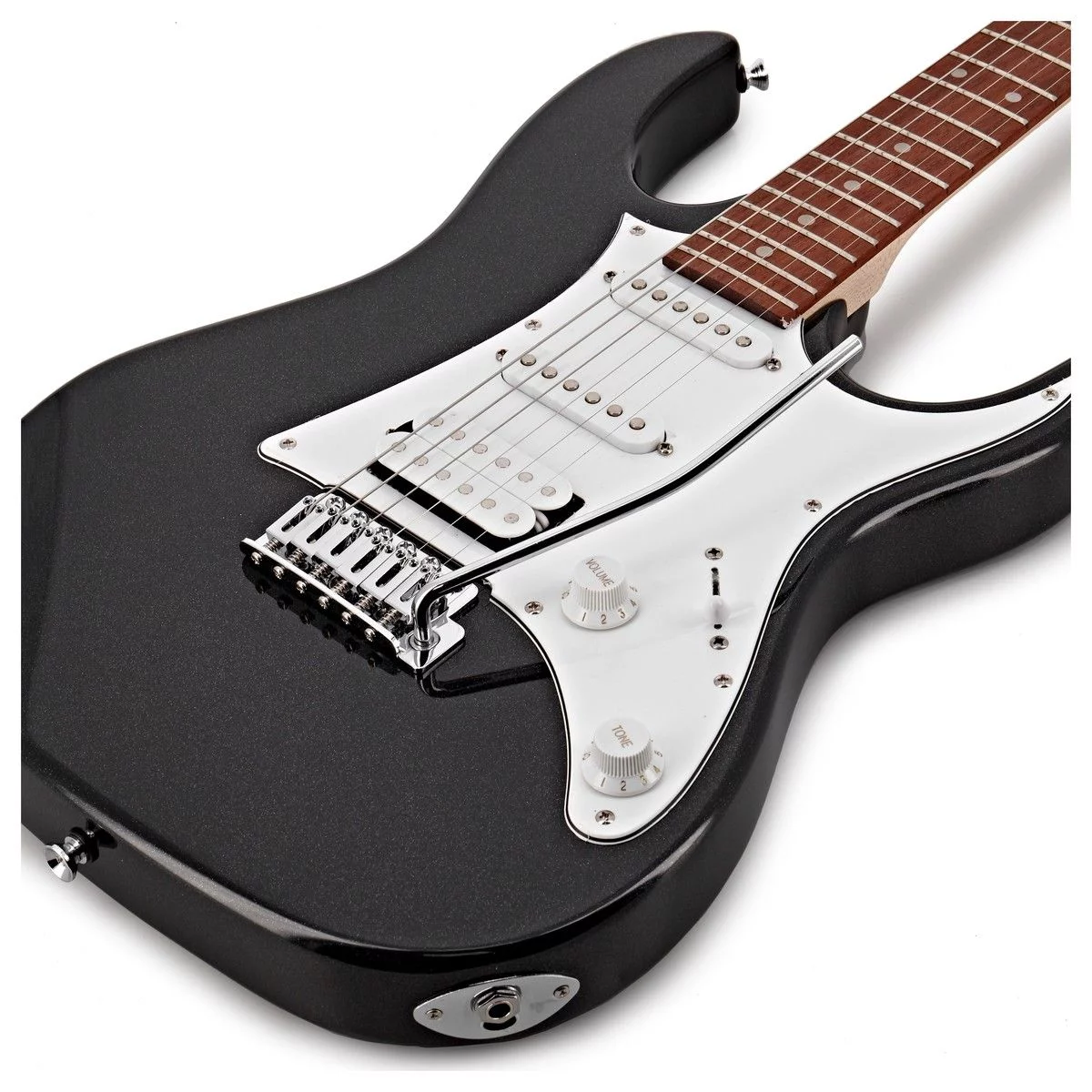 IBANEZ GRX40-BKN – шестиструнная электрогитара из самой узнаваемой линейки Ibanez – RG. Это инструмент с мощным звуком, идеальный для скоростной игры. Характерные черты гитары сформировались за три десятилетия развития металла. Корпус инструмента выполнен из тополя. Гриф GRX – из клена. Накладка на гриф – из специальным образом обработанной новозеландской сосны. Радиус накладки – 305 миллиметров. Мензура – 25,5 дюйма (648 миллиметров). На грифе 22 лада Medium, инкрустированных белыми точками. Звук формируется тремя пассивными звукоснимателями Infinity R с керамическими магнитами. Это два сингла, у грифа и в средней позиции, плюс хамбакер у бриджа. Переключатель – пятипозиционный. Настройка осуществляется регуляторами громкости и тембра. Бридж – тремоло собственного производства Ibanez T106, он обеспечивает удобство при игре и стабильность строя. Модель выпускается в двух вариантах цветового исполнения. Представленная гитара – стильного черного цвета «Black Night» с блестящей хромированной фурнитурой.