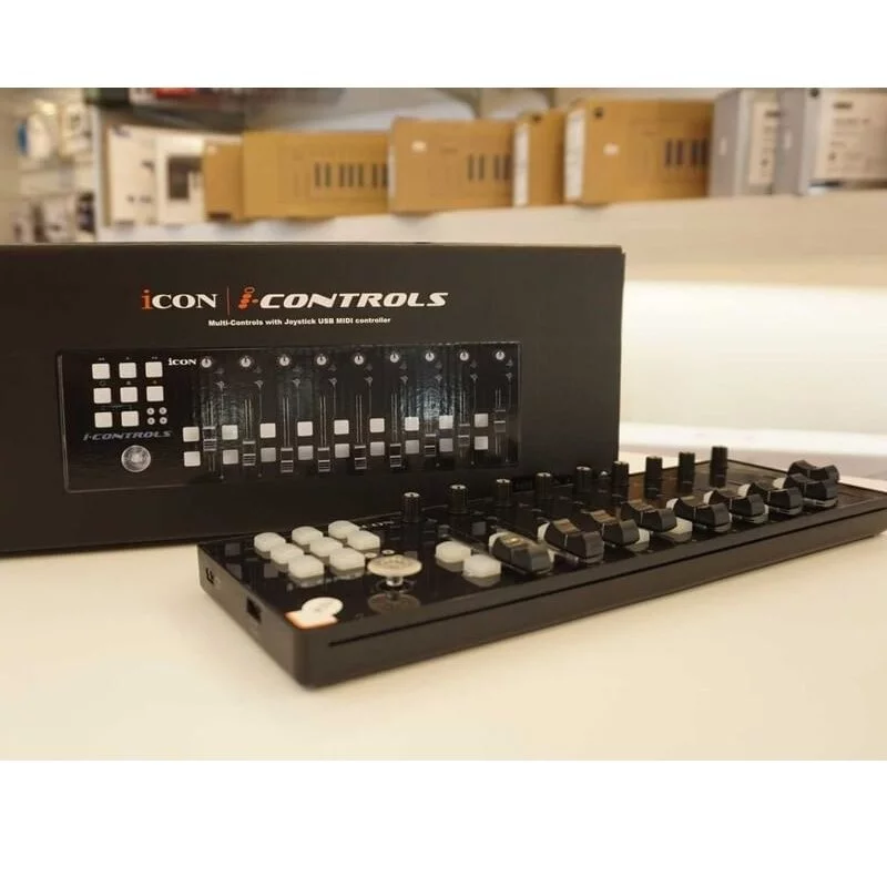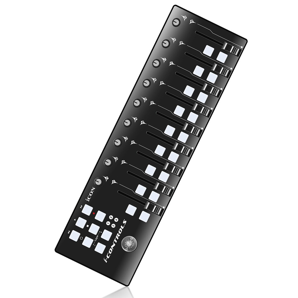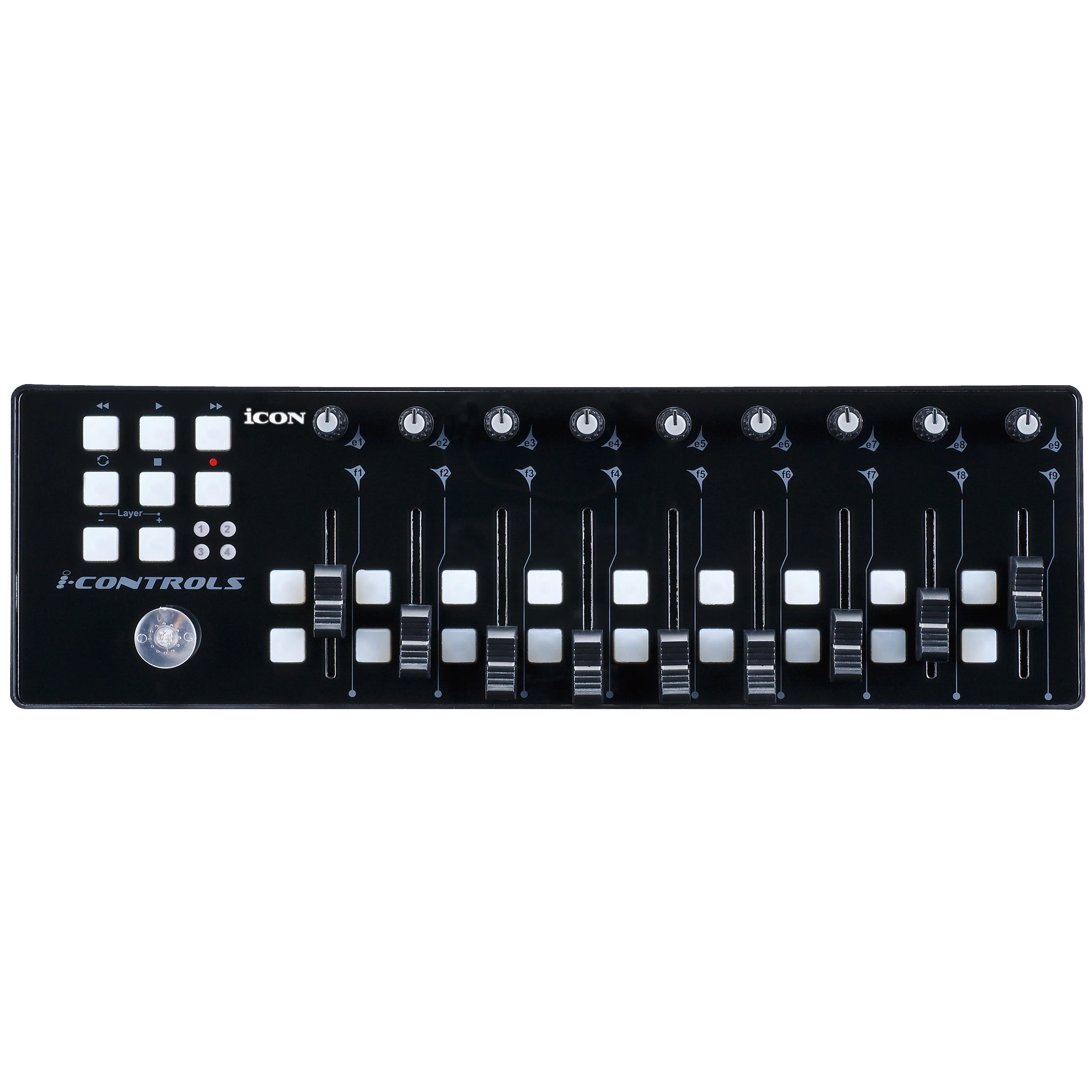 Особенности MIDI-контроллера iCON iControls, Портативный MIDI-контроллер для управления DAW, 9 фейдеров для управления каналами, 30 кнопок, 9 регуляторов, 1 джойстик, 4 пресета для пользовательских настроек, Поддержка протокола связи Mackie Control, Настройка MIDI-команд с помощью программы iMap, Подключение и питание по USB, Корректная работа на операционных системах Windows и macOS