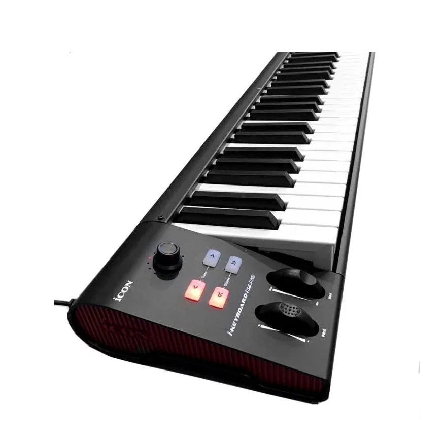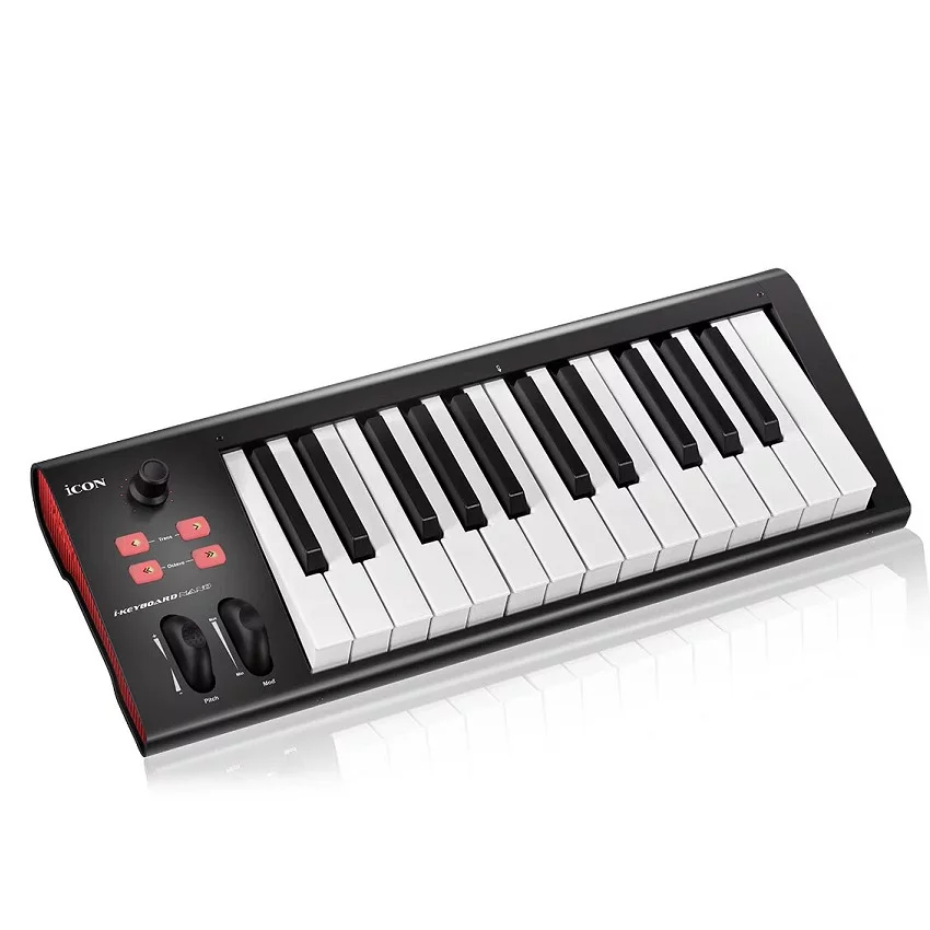 Для подключения к внешним синтезаторам или другим инструментам есть MIDI-выход на стандартном 5-контактном разъеме. Возможность автономной работы без компьютера обеспечивает разъем возможность подключения внешнего блока питания на 7 V DC, который приобретается отдельно., , MIDI-клавиатура iCON iKeyboard 3Nano представлена в прочном стальном корпусе, который обеспечивает безопасную транспортировку и защиту от случайных повреждений. Комплектация включает в себя USB-кабель, а лицензионные ключи для программы Bitwig 8-Track, плагина Harrison 32c Vocal Intensity Processor и наборов плагинов от Dotec audio, Tracktion и Kilohearts Toolbox., , Особенности MIDI-клавиатуры iCON iKeyboard 3Nano, Портативная MIDI-клавиатура, 25 полноразмерных полувзвешенных клавиш, 7 типов чувствительности к силе нажатия, 4 кнопки, 2 колеса и 1 энкодер, Поддержка протоколов Mackie Control и HUI для управления DAW, MIDI-выход, входы для педалей сустейна и экспрессии (приобретаются отдельно), Прочный стальной корпус, Возможность работы без компьютера в паре с внешним устройством, Питание по USB или от внешнего адаптера (в комплект не входит)