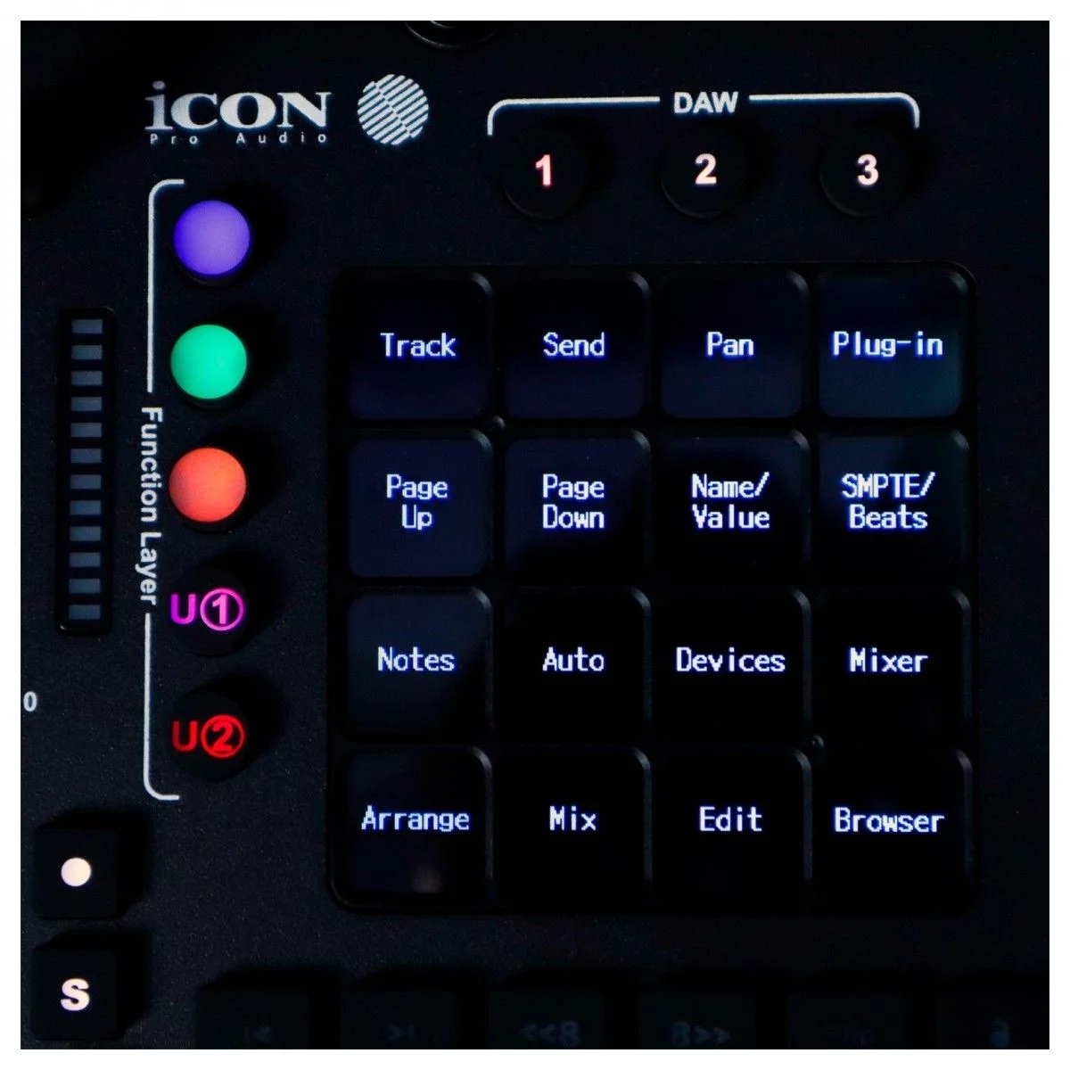 Программируемый 4-дюймовый цифровой сенсорный дисплей с 16 панелями, отображающий функции DAW в 5 цветовых режимах, потенциальное общее количество отображаемых и реализуемых функций 80