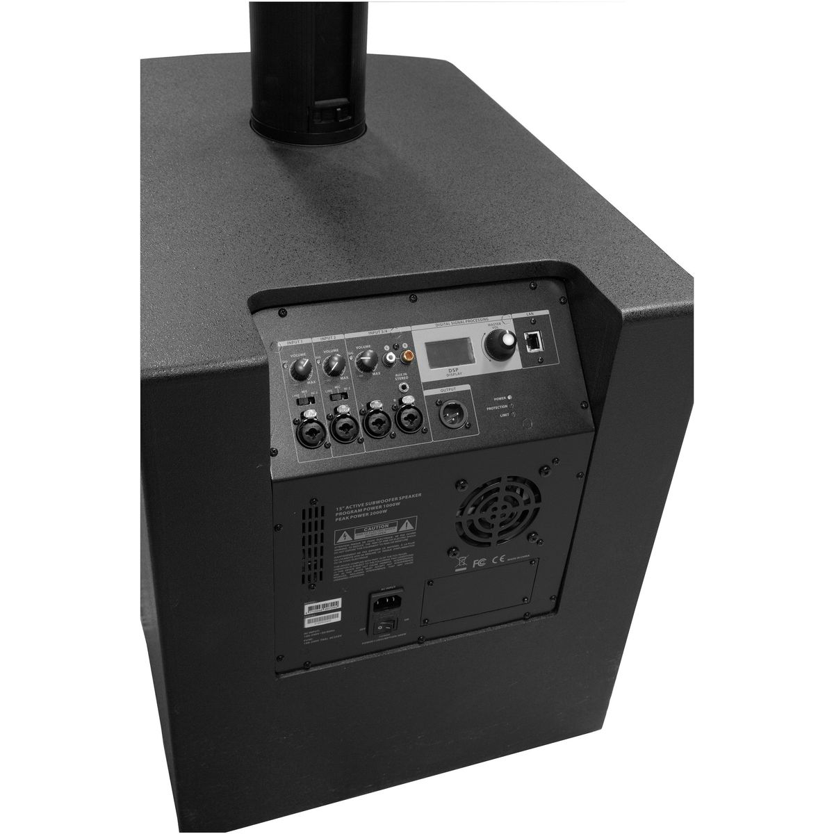 Нижняя часть колонны используется в качестве опоры для двух верхних сателлитов. Сабвуфер оснащен двумя усилителями класса D мощностью 1000 Вт. Все элементы управления, входы и выходы расположены на задней панели сабвуфера. Доступны 4 x микрофонных / линейных входа на разъем Combo XLR / и одного разъема RCA . Система оснащена встроенным DSP с такими программами, как LIVE / MUSIC / SPEECH / DJ. OLED-экран позволяет редактировать параметры, а также подключаться к ПК по локальной сети. В качестве источников сигнала доступны дополнительные модули MP3 и Bluetooth (поставляются отдельно) с дальностью работы до 10 метров.