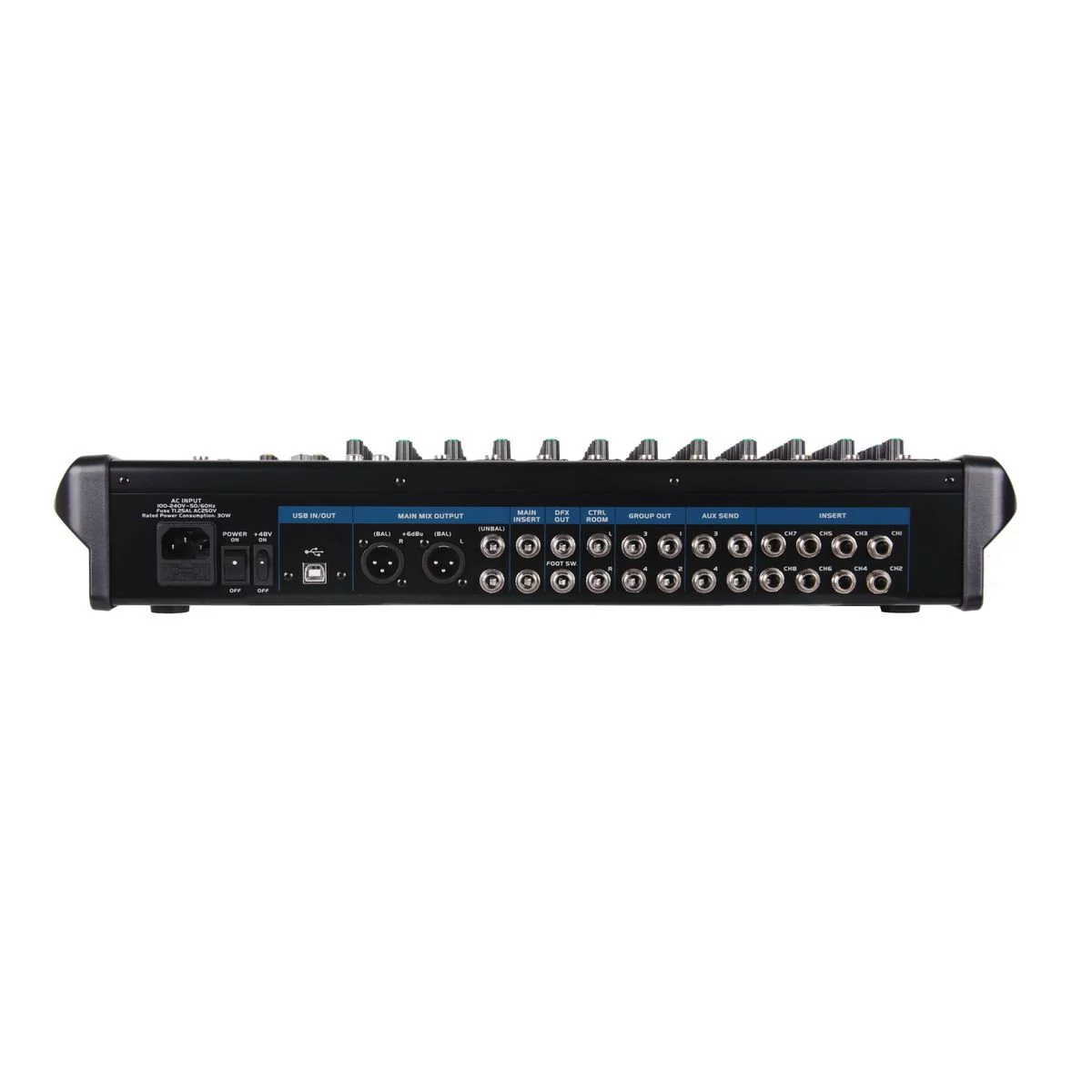 16 микрофонных входов, 4 компрессора на каналах с 1-4. Трехполосный параметрический эквалайзер с параметирческой серидиной на всех каналах микшерного пульта. Кнопки BYPASS для включения/отключения эквалайзера на всех каналах пульта.