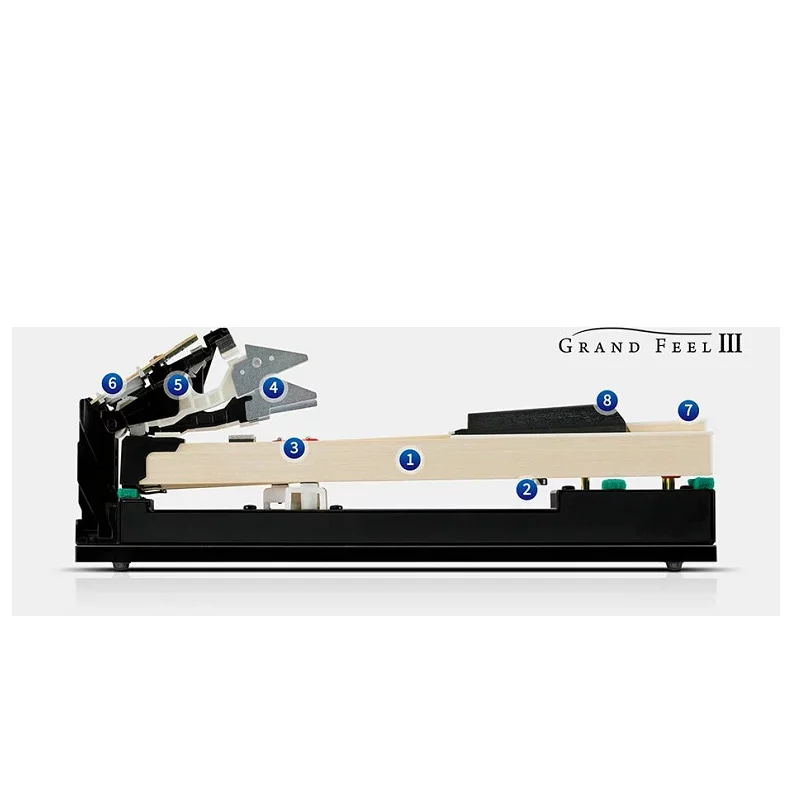 В дополнение к калиброванным молоточкам, Grand Feel III action также оснащен металлическими противовесами, прикрепленными под каждой клавишей и распределенными по длине клавиатуры.