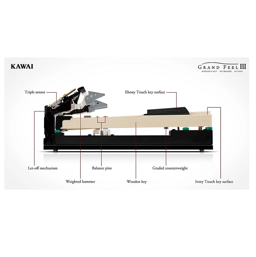 Механика Grand Feel III (GFIII) с функцией Let-Off, тройным датчиком и противовесами 88 деревянных клавиш с покрытием Ivory Touch и Ebony Touch