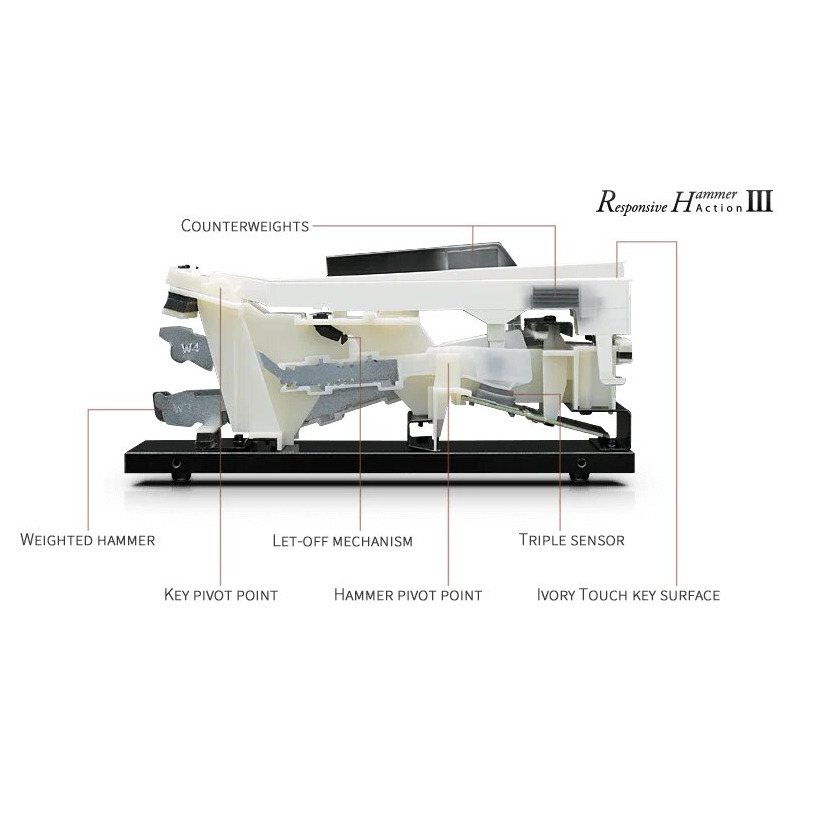 Механика Responsive Hammer III (RHIII) с функцией Let-Off, тройным сенсором и противовесами 88 взвешенных клавиш с покрытием Ivory Touch
