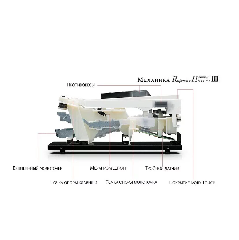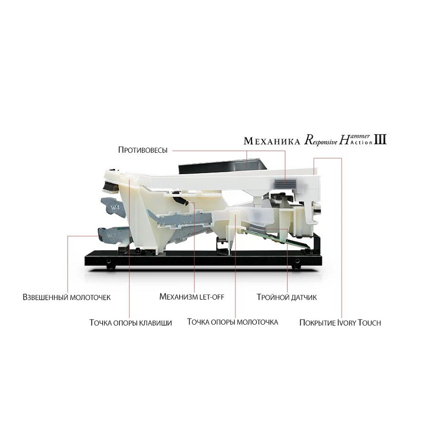 • Механика Responsive Hammer III (RH III) с функцией Let-off, с тремя датчиками на каждую клавишу и противовесами