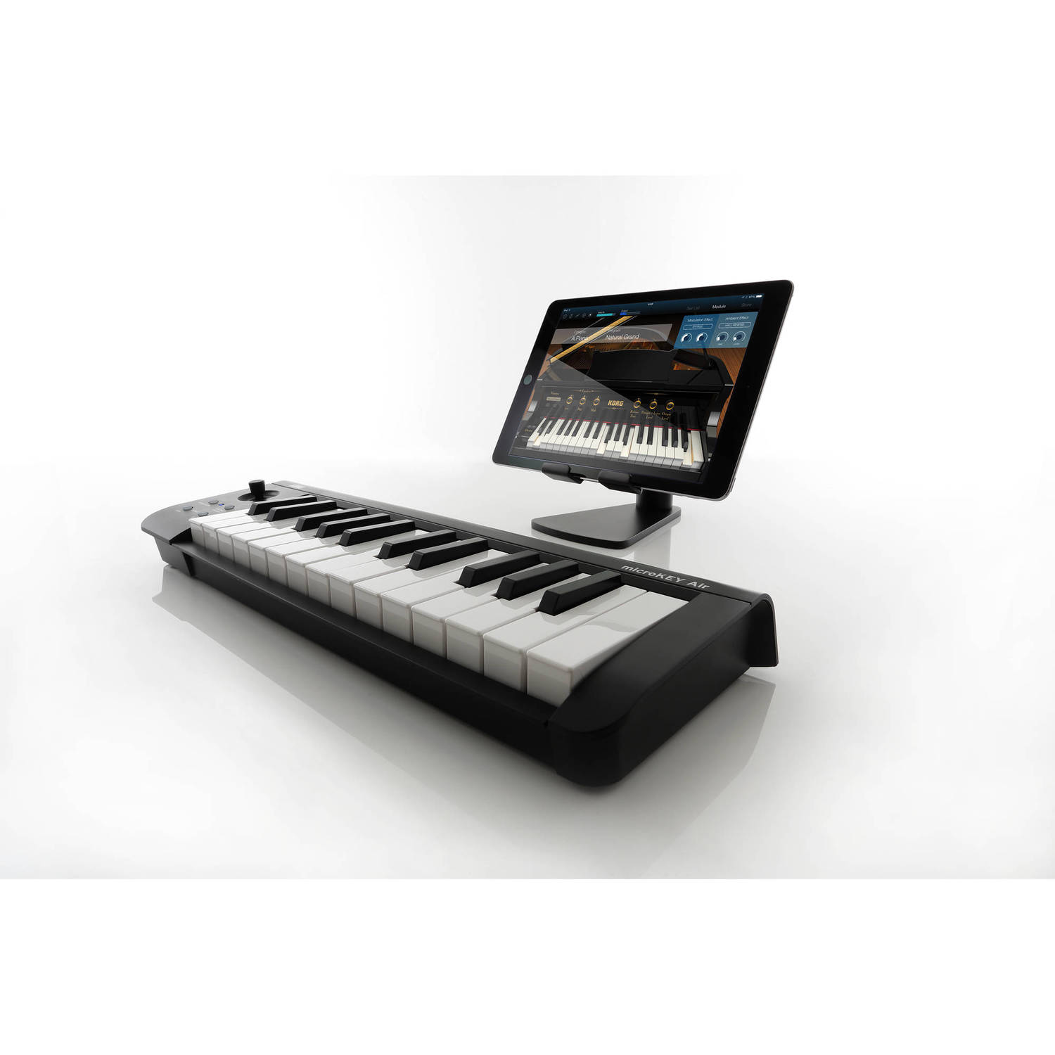 KORG MICROKEY2-25 BLUETOOTH MIDI KEYBOARD – компактная беспроводная MIDI клавиатура, популярная модель от известного производителя, простая и удобная в использовании, обладающая широкими возможностями. Это модель из второго поколения линейки microKEY, которая сохранила все достоинства предшествующих моделей и получила ряд новых современных функций, в том числе возможность беспроводного соединения, поддержку iPad и iPhone. KORG MICROKEY2-25 Air - универсальная модель, которая отличается простотой конструкции, маленькими размером и весом, удобством коммутации. Это младшая модель линейки с 25-клавишной мини-клавиатурой. Подключение осуществляется по Bluetooth или через разъем USB. Клавиатура совместима с компьютерами под управлением Windows и Mac OS. Электропитание клавиатуры осуществляется от двух батарей типа АА или через кабель USB. Примерный срок работы от батарей – 30 часов. К этой модели нельзя подключать педали, но имеется специальная кнопка, которая выступает в роли демпферной педали. Для настройки параметров звучания, в том числе использования арпеджиатора, используется специальный джойстик. Размеры клавиатуры всего 39,5 см х 13,1 см, высота – 5,2 см. Вес – 670 г. Эту миниатюрную модель удобно перевозить, её можно брать с собой в поездки и путешествия. В комплекте с клавиатурой поставляется большой набор программного обеспечения для работы с аудио материалом - как ПО для компьютера, так и приложения для мобильных устройств: KORG Gadget Le и KORG Module Le.