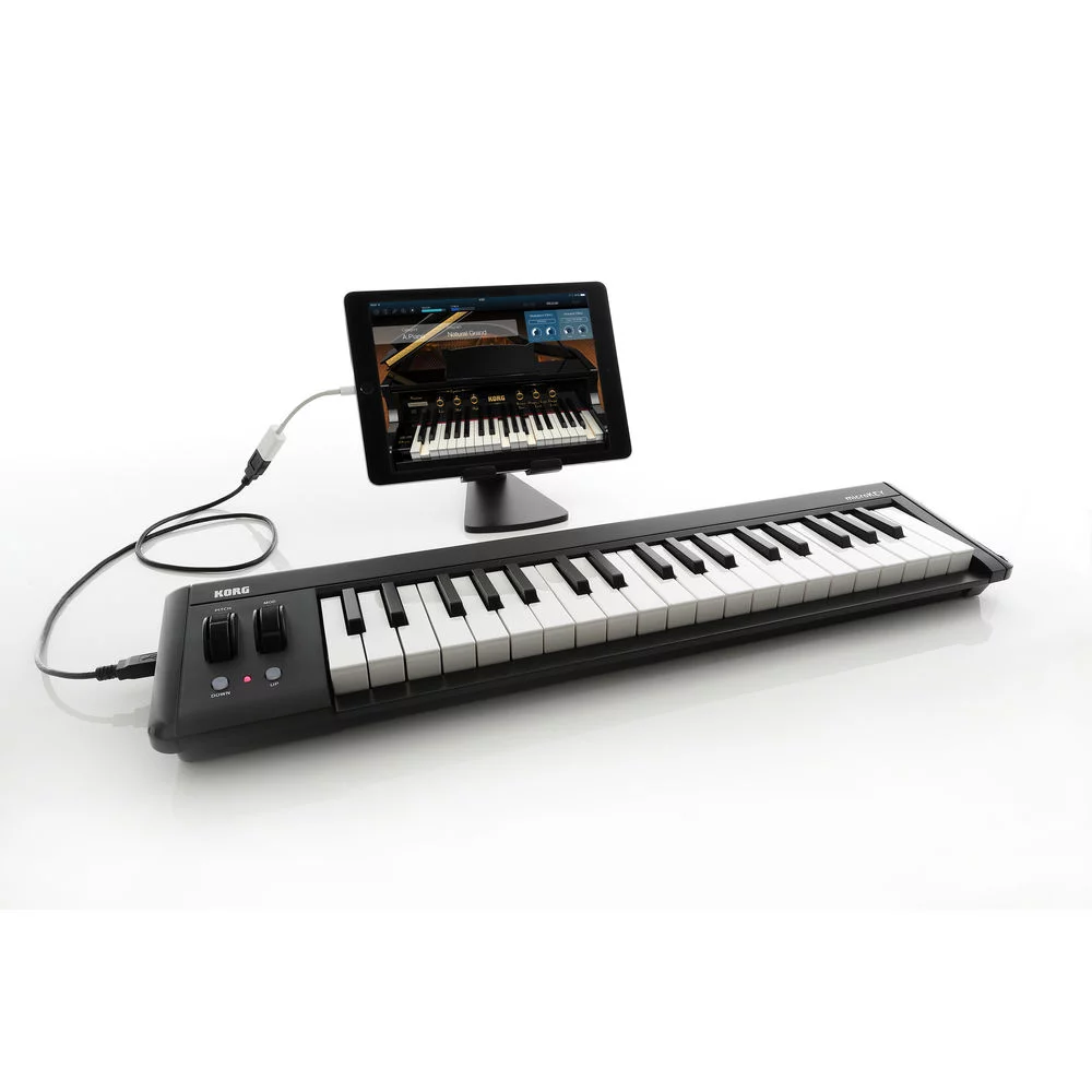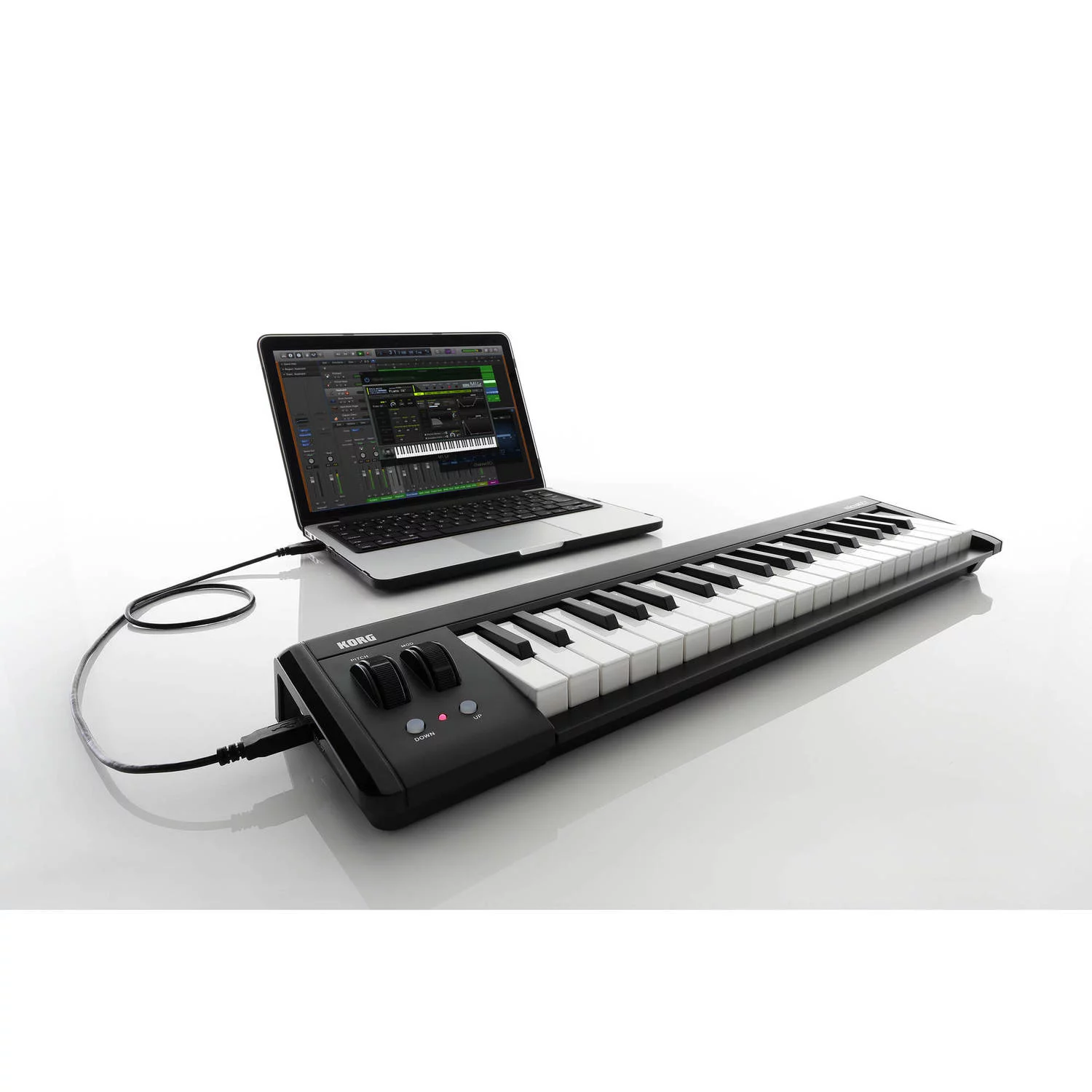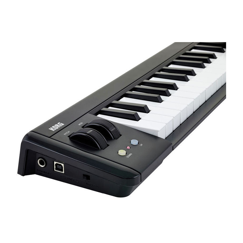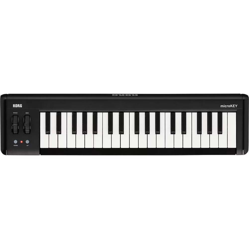 Korg Microkey2-37 – компактная беспроводная MIDI клавиатура, популярная модель от известного производителя, простая и удобная в использовании, обладающая широкими возможностями. Это модель из второго поколения линейки microKEY, которая сохранила все достоинства предшествующих моделей и получила ряд новых современных функций, в том числе возможность беспроводного соединения, поддержку iPad и iPhone. Korg Microkey2-37 Air - универсальная модель, которая отличается простотой конструкции, маленькими размером и весом, удобством коммутации. Мини-клавиатура оснащена 37 клавишами Natural Touch. Подключение осуществляется по Bluetooth или через разъем USB. Клавиатура совместима с компьютерами под управлением Windows и Mac OS. Электропитание клавиатуры осуществляется от двух батарей типа АА или через кабель USB. Примерный срок работы от батарей – 30 часов. Новые функции клавиатуры включают поддержку демпферных педалей для удобства музыкантов. Для настройки параметров звучания используются два колесика (Pitch bend, Modulation) и кнопка октавного смещения. Размеры клавиатуры - 56,5 см х 13,9 см, высота – 5,4 см. Вес – 1 кг. Эту компактную модель удобно перевозить, её можно брать с собой в поездки и путешествия. В комплекте с клавиатурой поставляется большой набор программного обеспечения для работы с аудио материалом - как ПО для компьютера, так и приложения для мобильных устройств: KORG Gadget Le и KORG Module Le.
