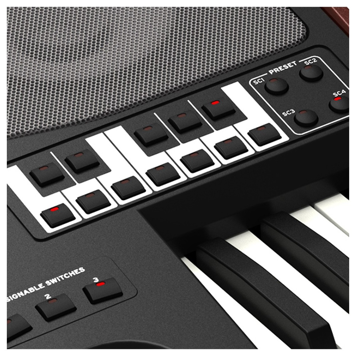 Есть встроенная стереосистема (2 x 25 Вт), выход на наушники, большой сенсорный дисплей (7"). Размеры синтезатора составляют 103,0 x 13,2 x 37,8 cм. Вес - 9,9 кг. В комплекте поставки находится сетевой кабель, пюпитр и руководство эксплуатации.