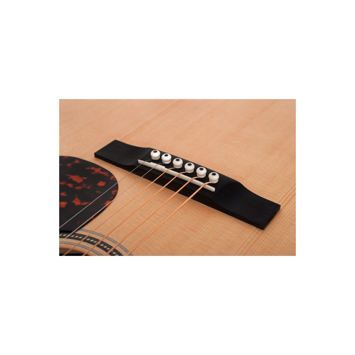 Массив ели в верхней деке даёт инструменту прекрасную атаку и читаемые верха, а обечайка и нижняя дека из махагони добавляет мощных средних частот. В итоге инструмент звучит более сфокусированно. Но что делает гитары Larrivee уникальными, так это, конечно, разработанная Jean Larrivee система брэйсинга. Будучи молодым, Jean сделал ставку на то, что симметричный рисунок крепления пружин как у классических гитар, может способствовать более сбалансированному тону звучания. И он оказался прав, с тех пор гитары Larrivee славятся своим безупречным вниманием к балансу.
