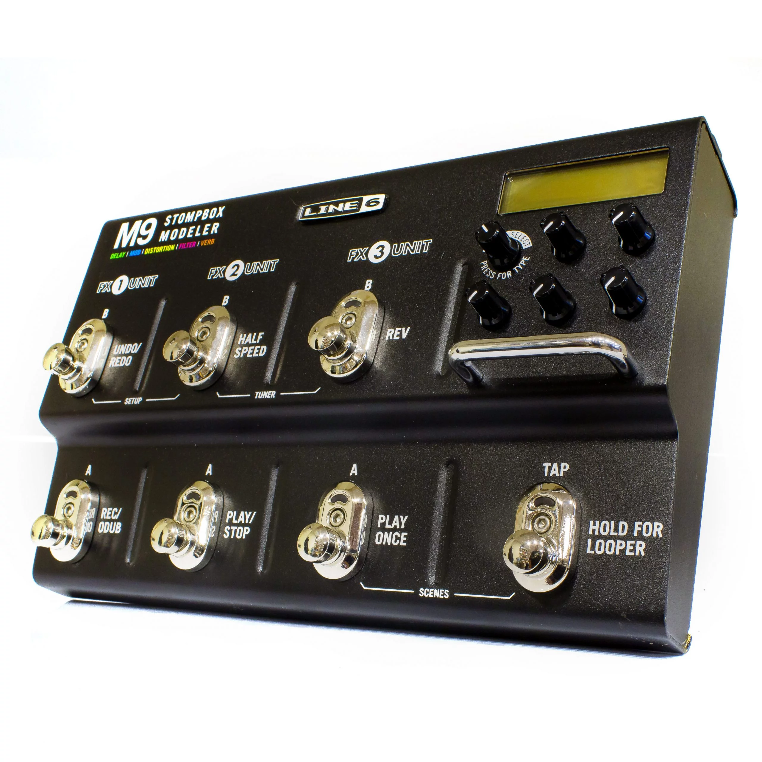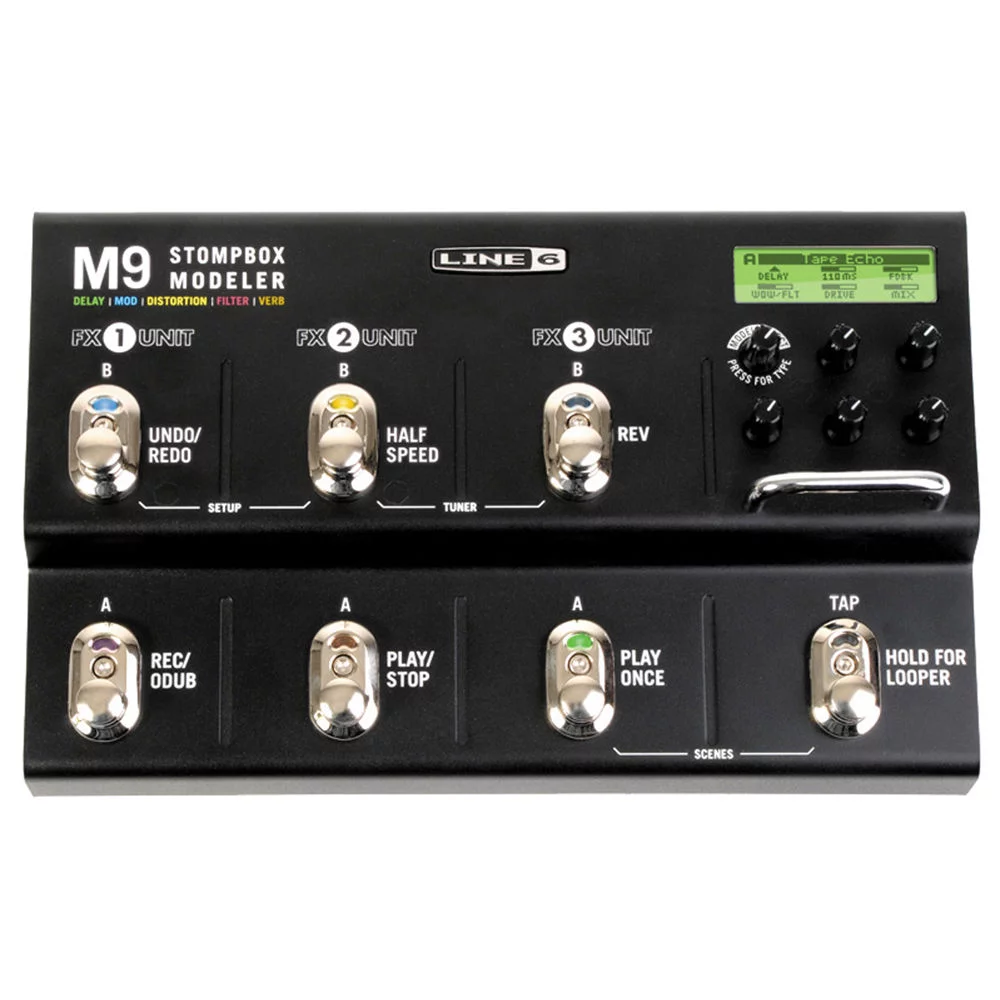 Line 6 M9 Stompbox Modeler представляет собой напольный гитарный процессор. Устройство несет на борту более 75 типов эффектов (более 100 в новой версии прошивки от Line6). Гитаристам доступна возможности использования 3 педалей эфФектов одновременно, причем в любом порядке и в любом наборе. Есть несколько переключаемых сцен и конфигураций работы педалборда. Интегрированный лупер на 28 секунд с отдельными кнопками функций Undo, Record/Overdub, Play/Stop, Half Speed поможет организовать более оригинальное выступление и музыкальное шоу.