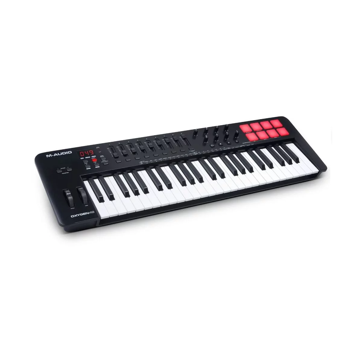USB MIDI клавиатура M-Audio Oxygen 49 MKV - пятое поколение миди-клавиатуры серии Oxygen с 49 полноразмерными клавишами и восемью пэдами, чувствительными к силе нажатия, восемью назначаемыми ручками и девятью фейдерами для управления плагинами и виртуальными инструментами.