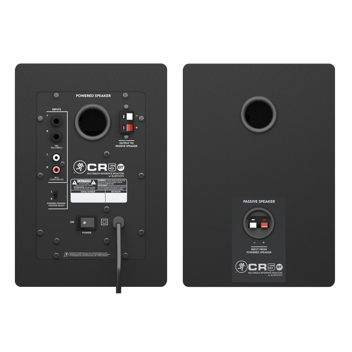 Mackie CR5BT - пара активных 5" студийных мониторов. Главным преимуществом АС выступает встроенный модуль Bluetooth 3.0, обеспечивающий беспроводное проигрывание аудиоматериала с различных устройств. Модель можно использовать как мультимедийную акустику или в профессиональном применении. CR5BT оснащен мидвуферами и 19 миллиметровыми твитерами, имеющими шелковые купола с нагрузкой на волновод. Корпус системы сделан из MDF. Находящийся в активной АС усилитель класса A/B выдает на выходе 50 Вт мощности. Коммутация включает стереовыходы на 2xTRS и 2xRCA. Кроме того, на лицевую панель вынесены миниджеки выхода под наушники и входа AUX. Комплектация включает изолирующие подставки и кабель 1/8” – 2 ? RCA.