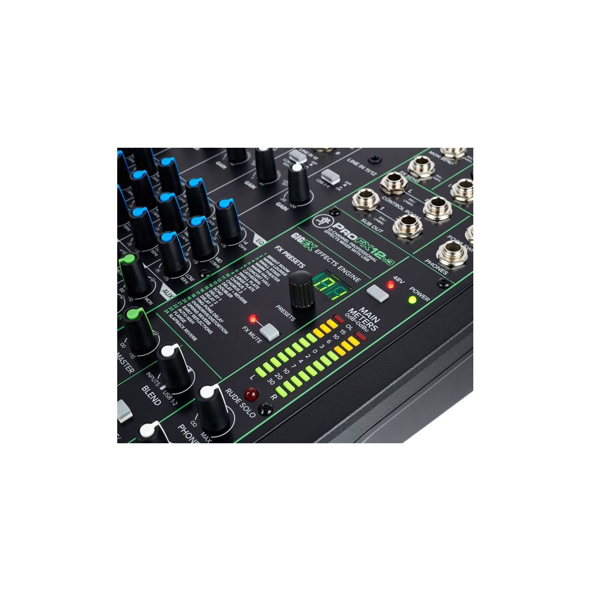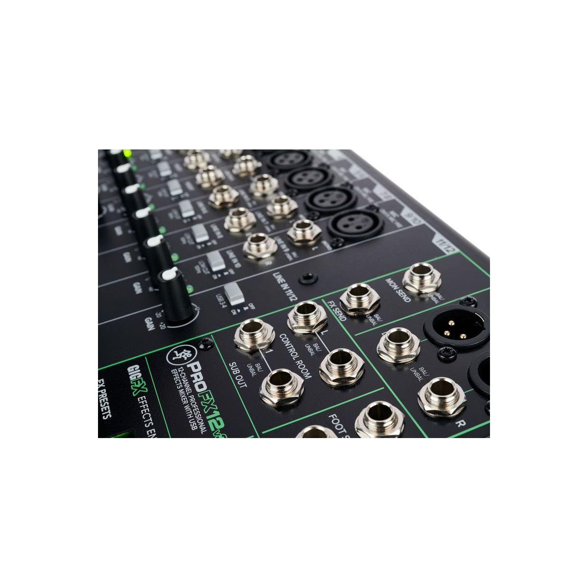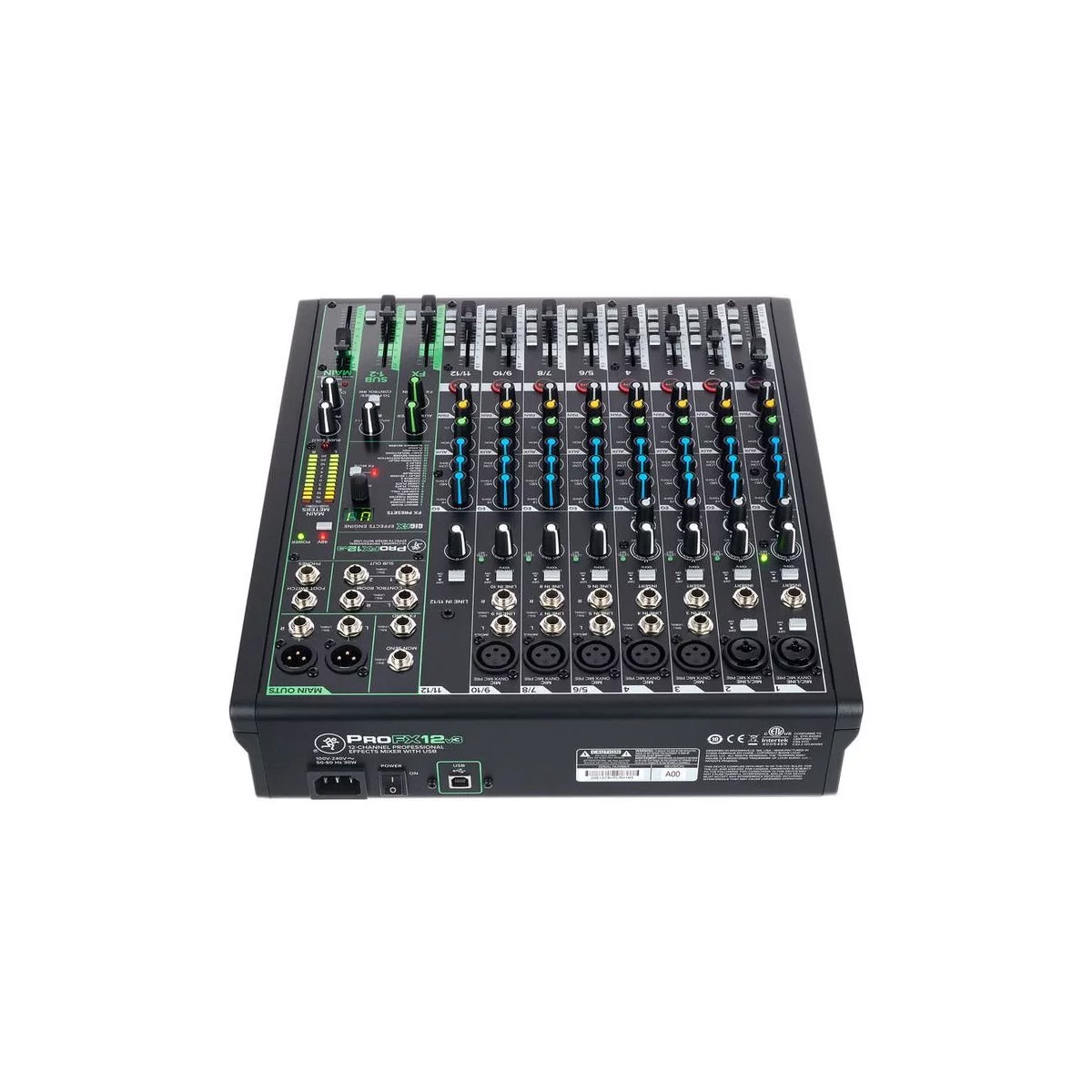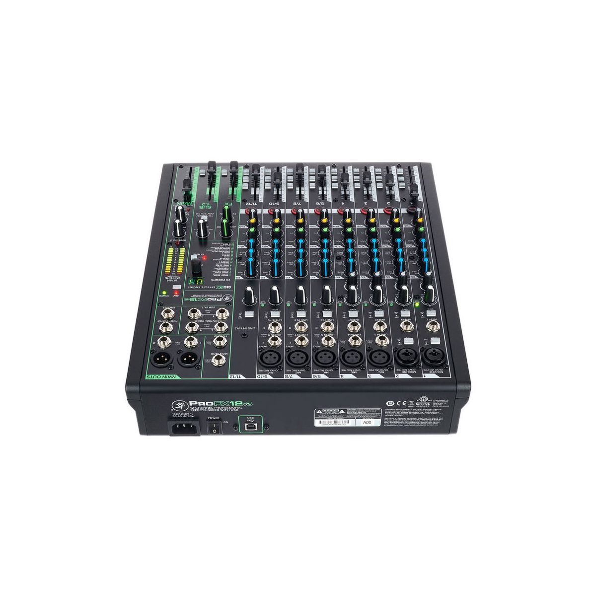 Mackie ProFX12v3 - 12-канальный микшер с интегрированным USB-аудиоинтерфейсом и процессором эффектов. Подходит для живого сведения и домашней звукозаписи. Микрофонные каналы оборудованы предусилителями Onyx. Пульт оборудован процессором эффектов GigFX с 24 типами пространственной обработки звука. Возможен посыл двух миксов с компьютера на микшер. Для мониторинга без задержки доступна функция Blend, которая позволяет регулировать баланс между прямым сигналом с пульта и выходным сигналом из DAW. Кроме того, доступна функция single-knob compression. USB-интерфейс обеспечивает запись в формате 24 бит/192 КГц. Достигается нулевой уровень задержки при мониторинге. На каждом канале доступны переключатели Hi-Z, которые позволяют включать инструменты напрямую. Также на всех микрофонных каналах есть подведенное фантомное питание и интегрированный low-cut фильтр (100 Гц). В комплекте с пультом поставляется ПО ProTools | First и Waveform OEM, а также библиотека плагинов под эти платформы.