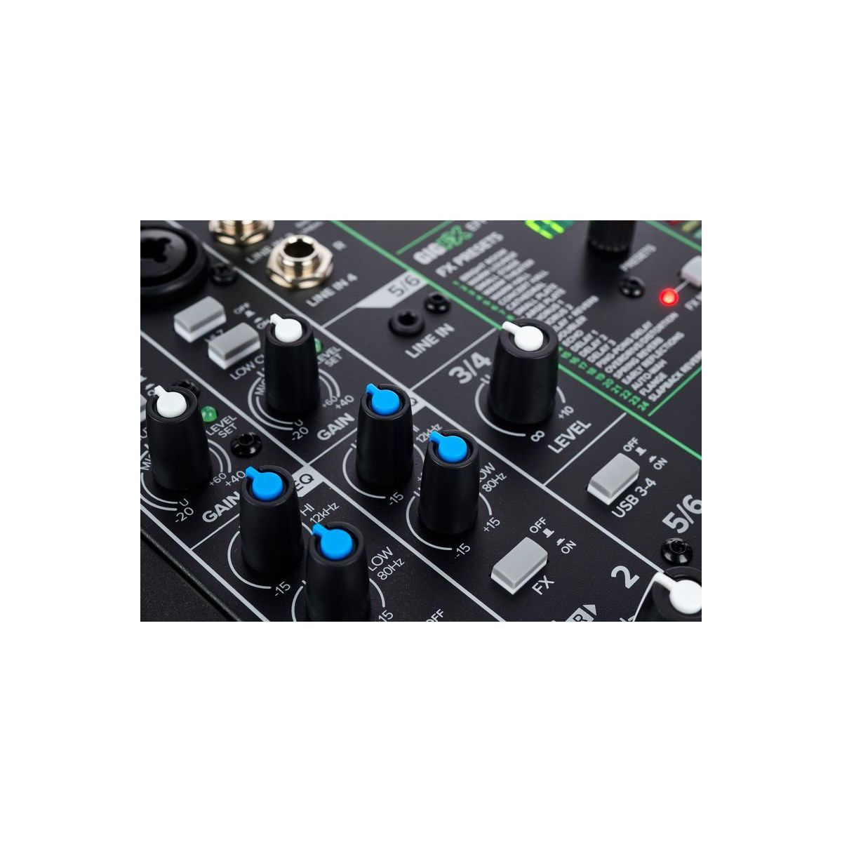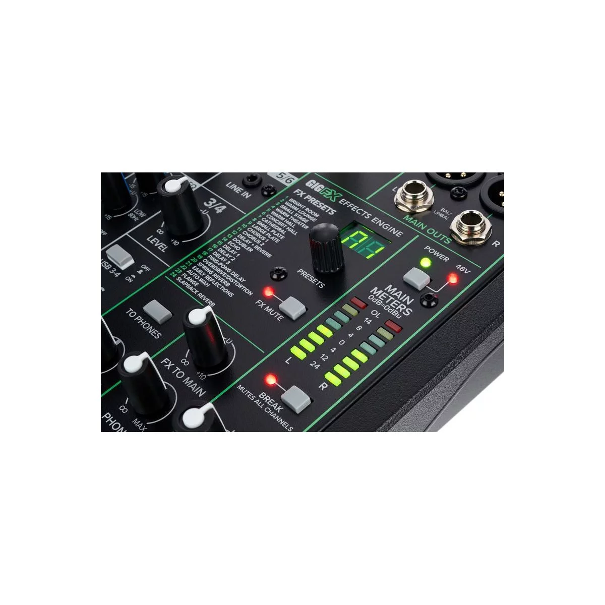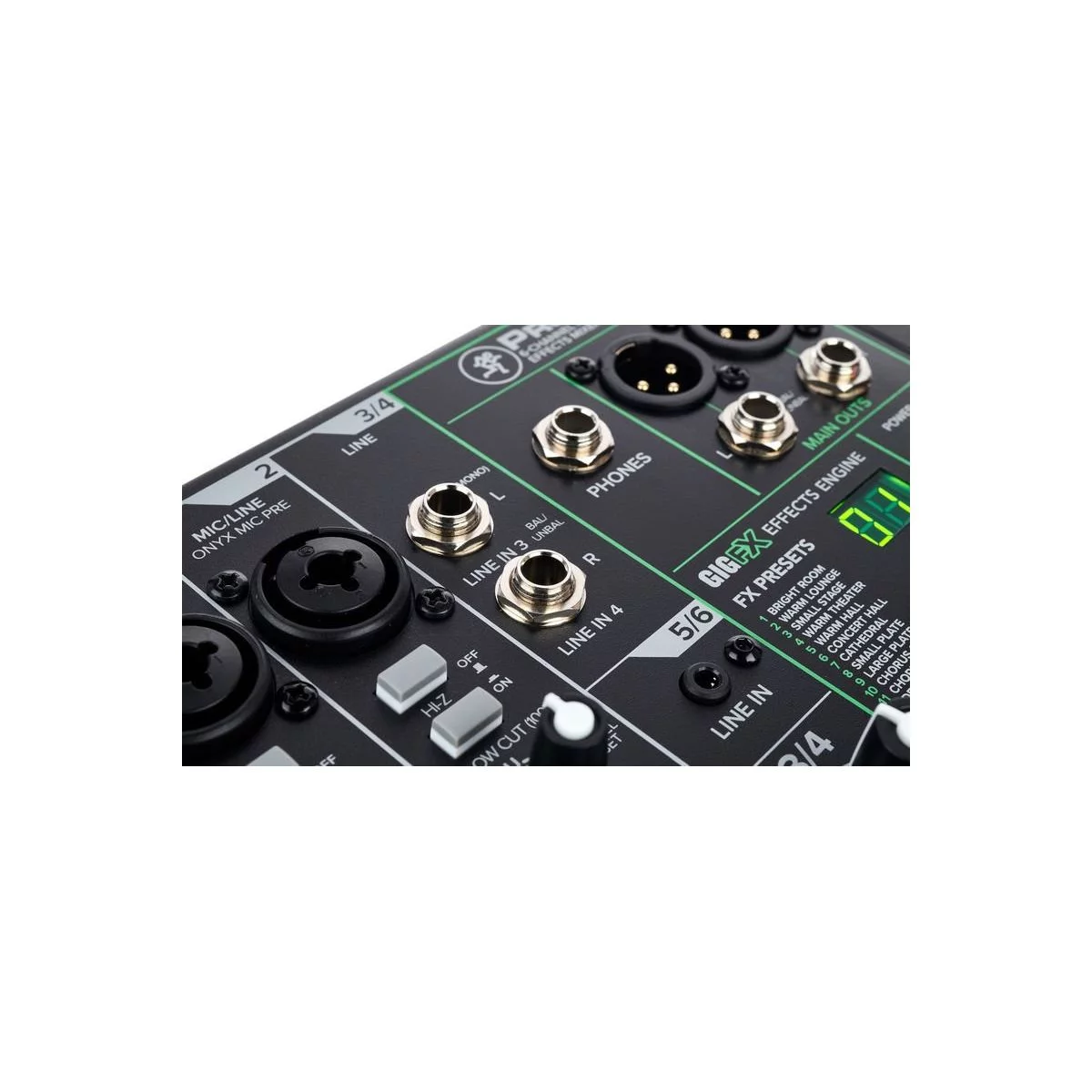 Mackie ProFX6v3 — 6-канальный аналоговый микшер с USB-подключением и встроенным процессором эффектов. Предназначен для работы на живых площадках, домашней записи и быстрого создания аудиоконента и стримов. Пульт оборудован микрофонными предусилителями Onyx с запасом по громкости 60 Дб и сверхнизким уровнем остаточного шума. Микшер располагает процессором эффектов GigFX с 24 видами обработки сигнала. Формат записи — 24 бит/192 КГц. Достигается нулевой уровень задержки при мониторинге. На каждом канале доступны переключатели Hi-Z, которые позволяют включать инструменты напрямую. Также на всех микрофонных каналах есть подведенное фантомное питание и интегрированный low-cut фильтр (100 Гц). В комплекте с пультом поставляется ПО ProTools | First и Waveform OEM, а также библиотека плагинов для работы с этим софтом.