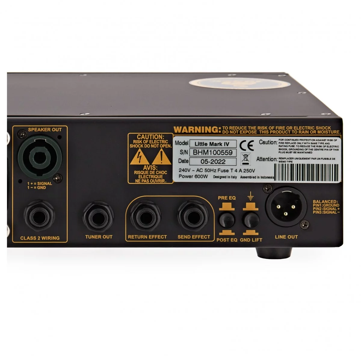 На передней панели усилителей серии Little Mark IV удобно расположены: переключатель MUTE наряду с ручкой регулировки уровня линейного выхода, которая позволяет точно контролировать сигнал, подаваемый на микшер / PA. На задней панели находится переключатель Pre-Post EQ, позволяющий при необходимости настроить маршрутизацию XLR-выхода до или после эквалайзера.