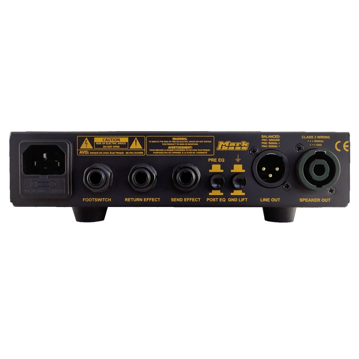 При скромных размерах задняя панель вмещает балансный выход XLR c переключателями Pre/Post EQ и GND Lift, петлю эффектов, выход на кабинет с разъемом Speakon и вход для опционального ножного переключателя, активирующего пресет эквалайзера SCOOP (утопленаая середина с приподнятыми низом и верхом).