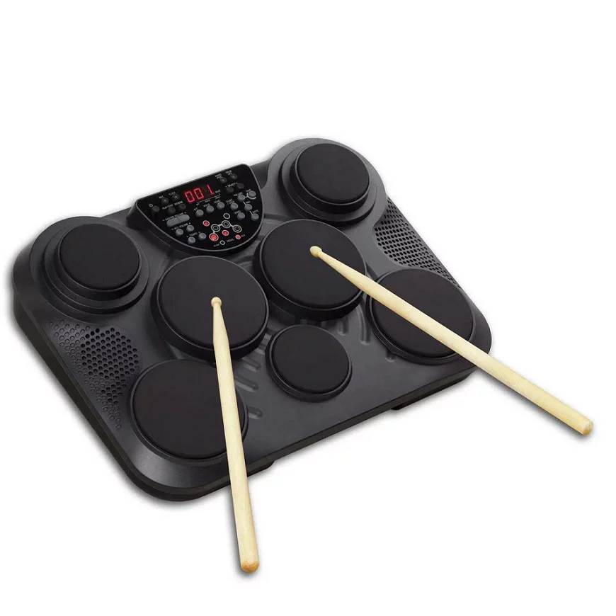 Портативная электронная ударная установка с 7 пэдами, чувствительный к прикосновению, 2 педали пэдов, барабанные палочки в комплекте.