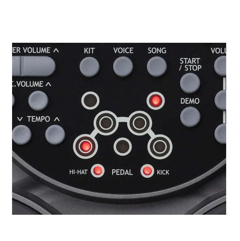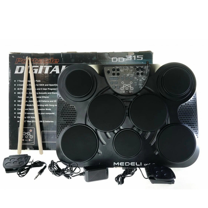 Благодаря 7 сенсорным пэдам и 2 ножным педалям DD315 обладает возможностями полноценной ударной установки размером с портативный барабан. Он обеспечивает барабанных 265 звуков , 45 наборов ударных и 100 предустановленных песен.