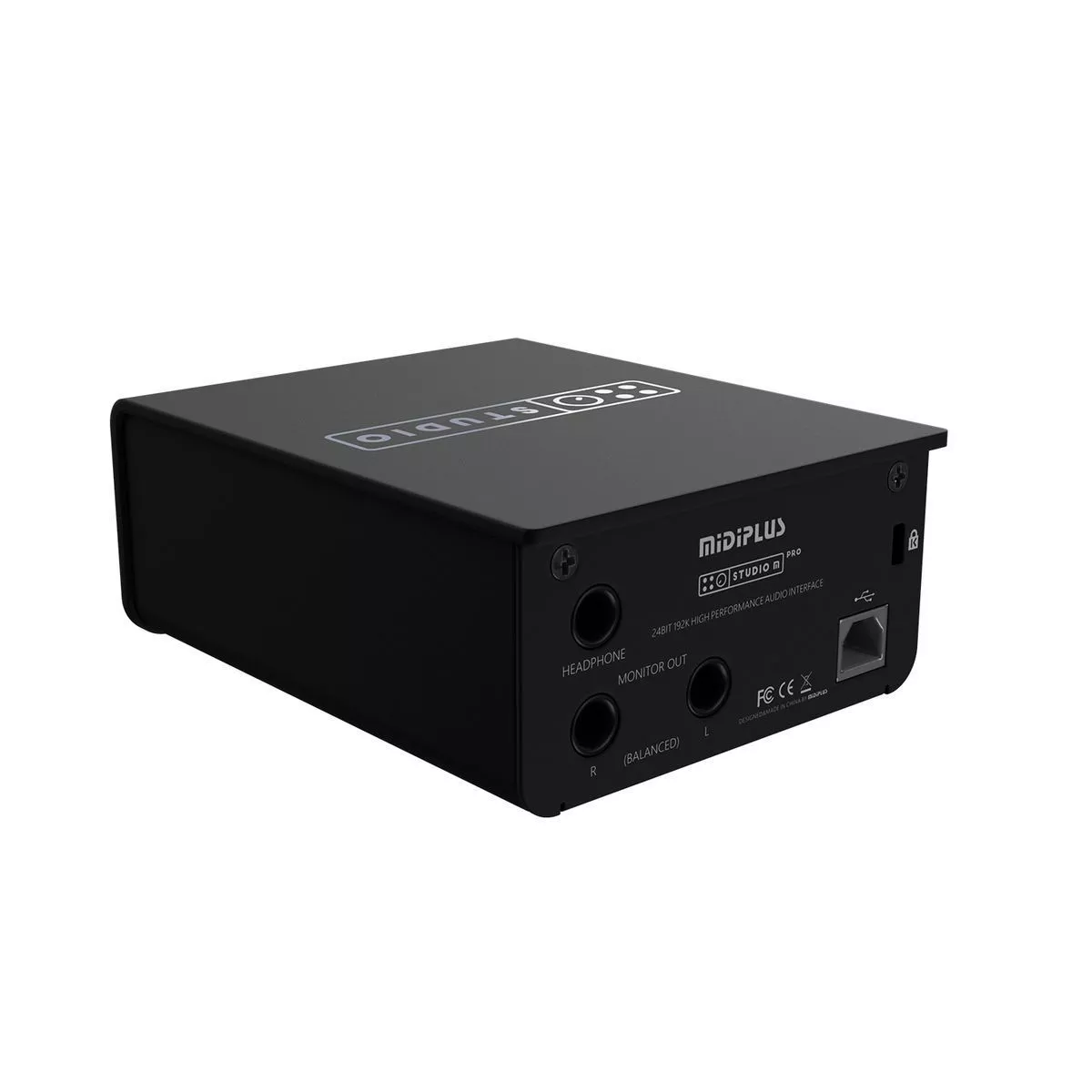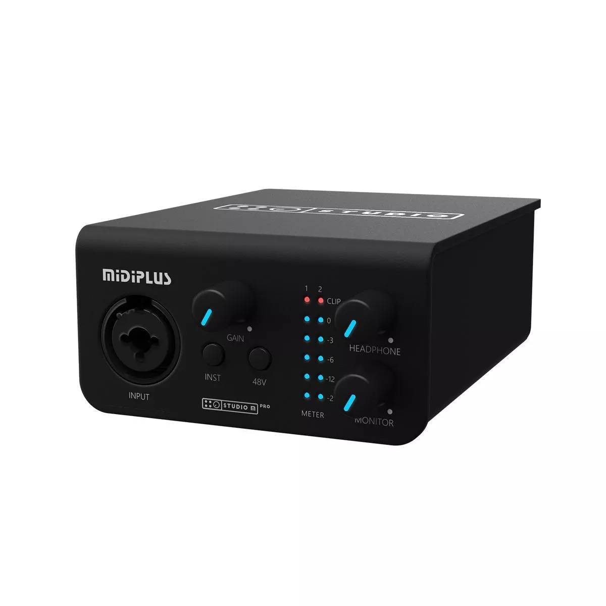 MiDiPLUS Studio M Pro OTG — 1-канальный USB-аудиоинтерфейс с 1 микрофонным/инструментальным предусилителем, портом USB-OTG, прямым мониторингом в моно или стерео и 6-сегментными измерителем выходного сигнала.