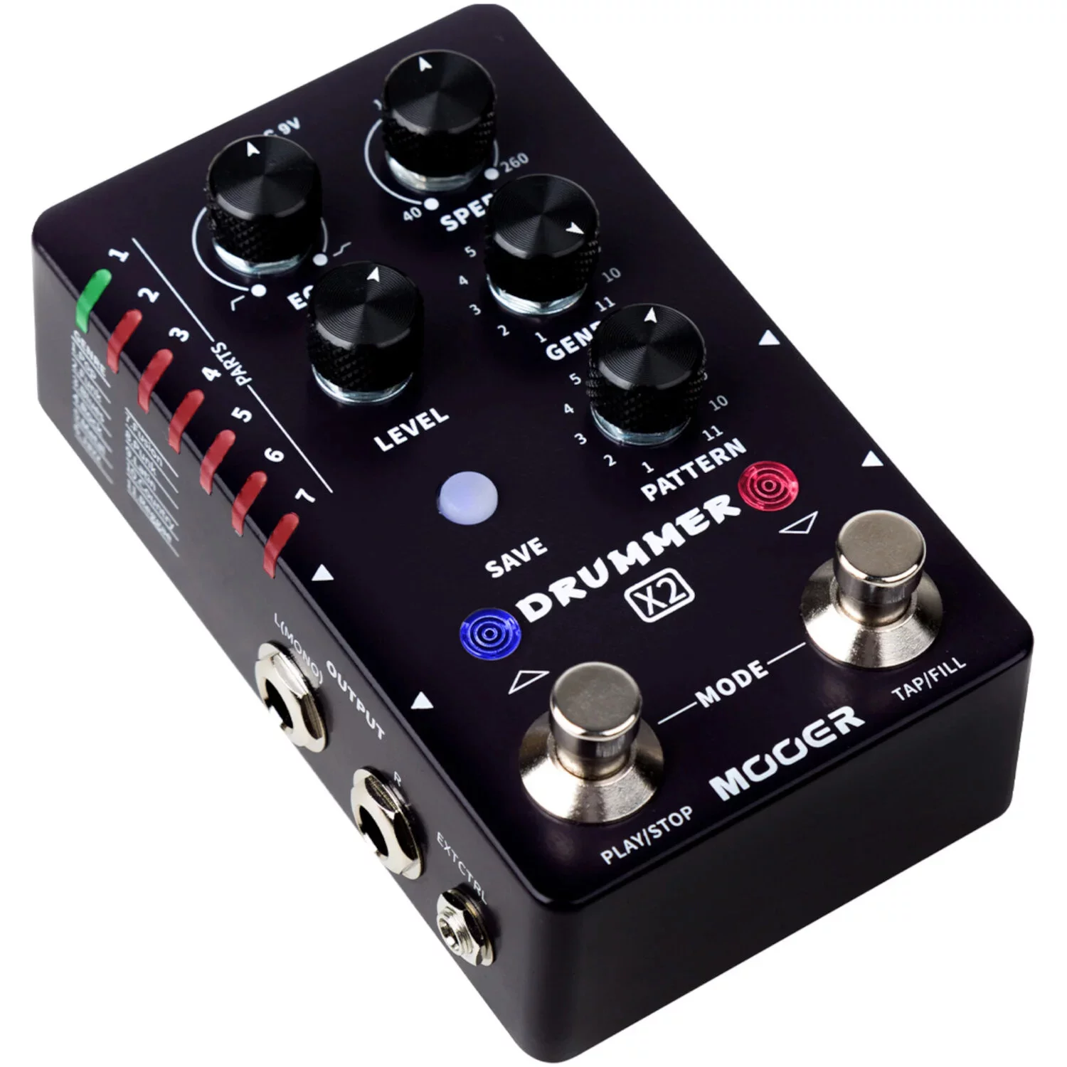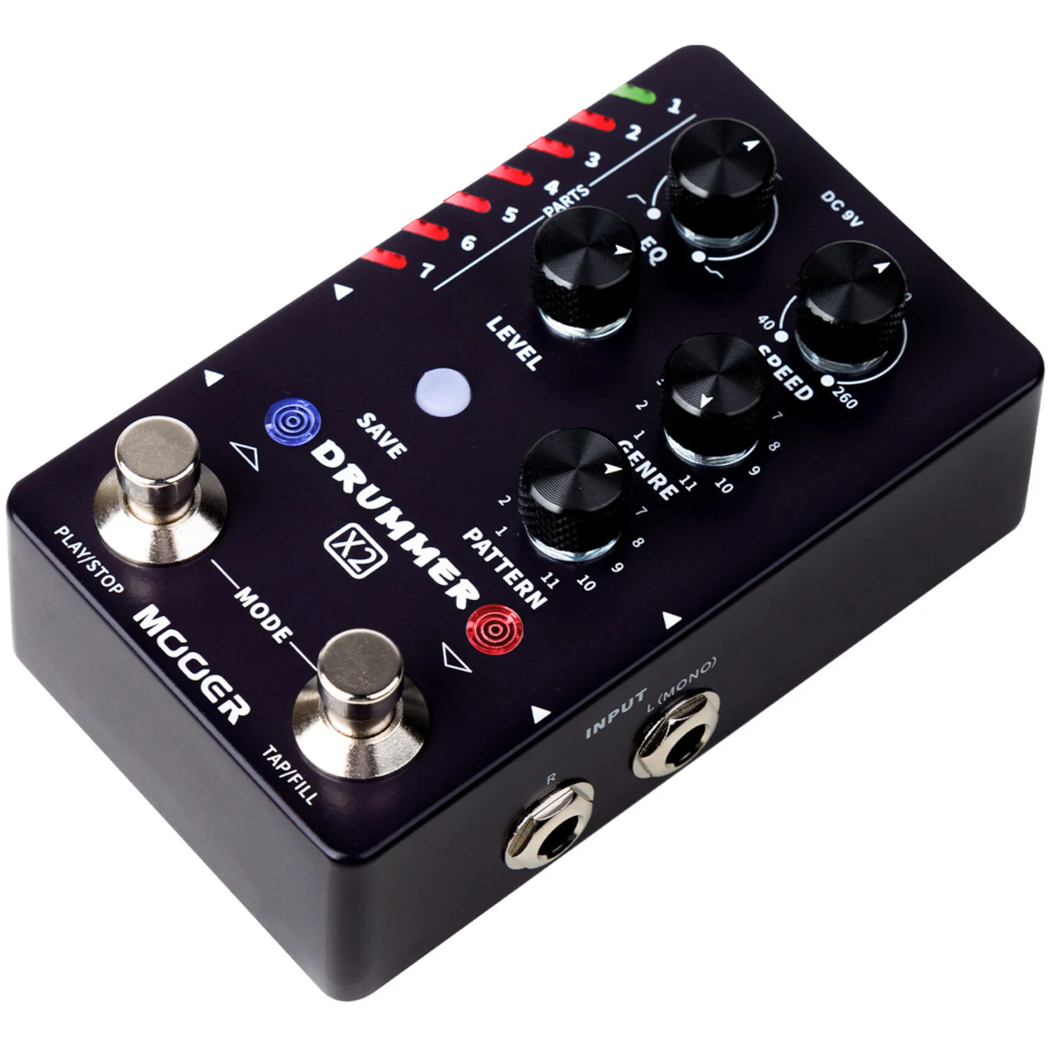 MOOER Drummer X2 позволяет гитаристам использовать популярные барабанные грувы из 11 различных музыкальных жанров, с 11 различными вариациями грува для каждого жанра. Любимые грувы и темпы можно легко сохранить в