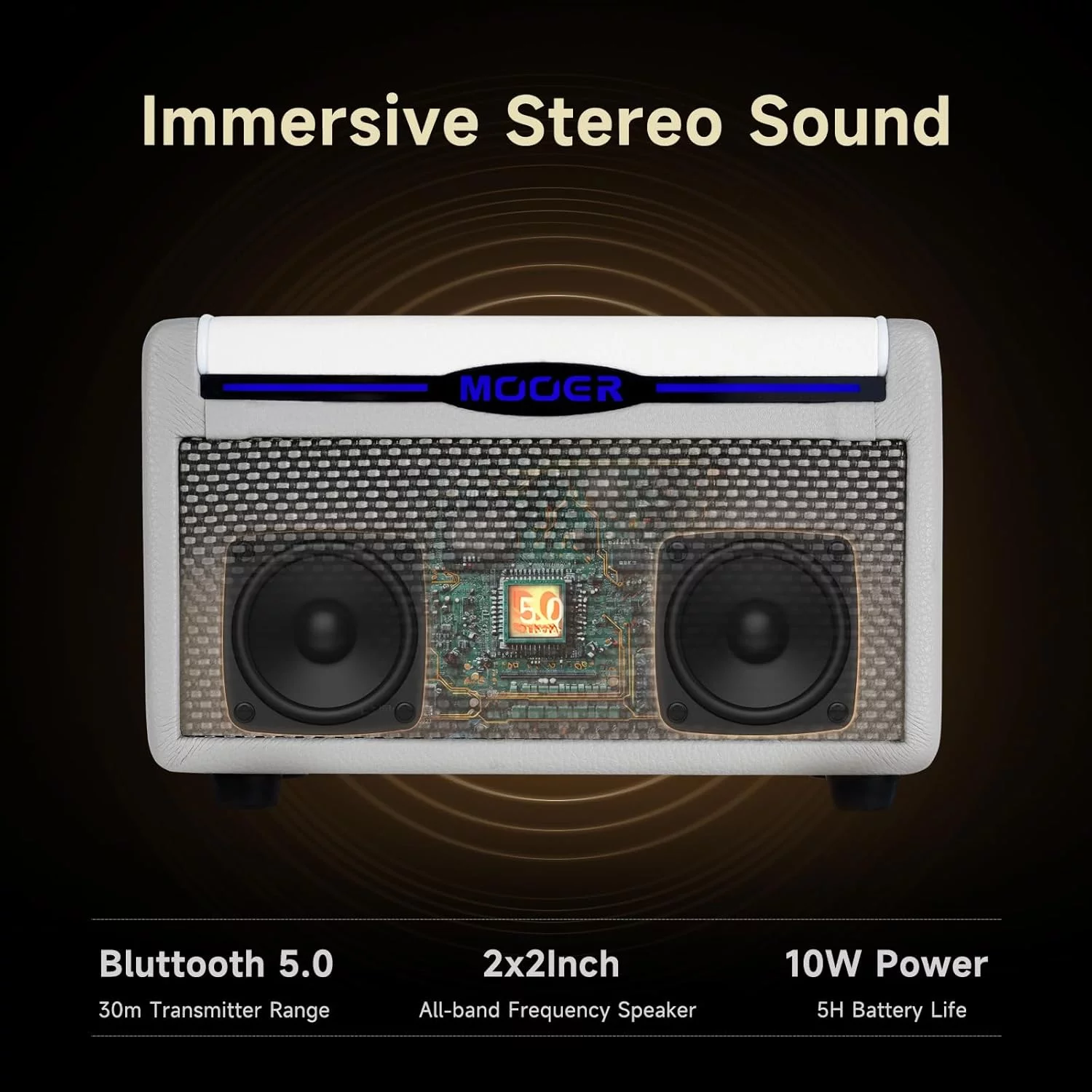 Аккумуляторная батарея обеспечивает до 5 часов автономной работы, можно брать его с собой в поездку. Также имеется поддержка беспроводного ножного переключателя Mooer GWF4. Оснащение высококачественным аудиовходом Bluetooth 5.0.