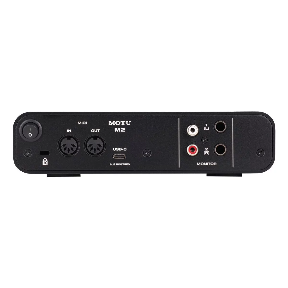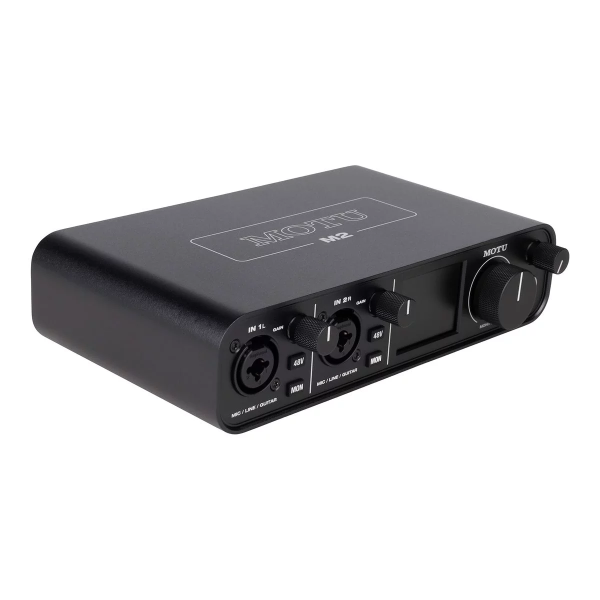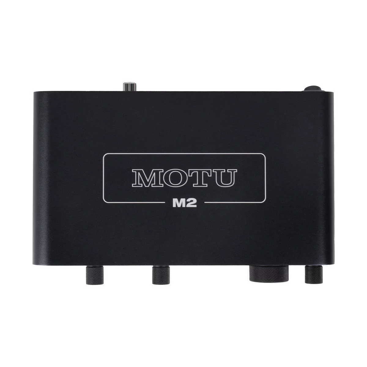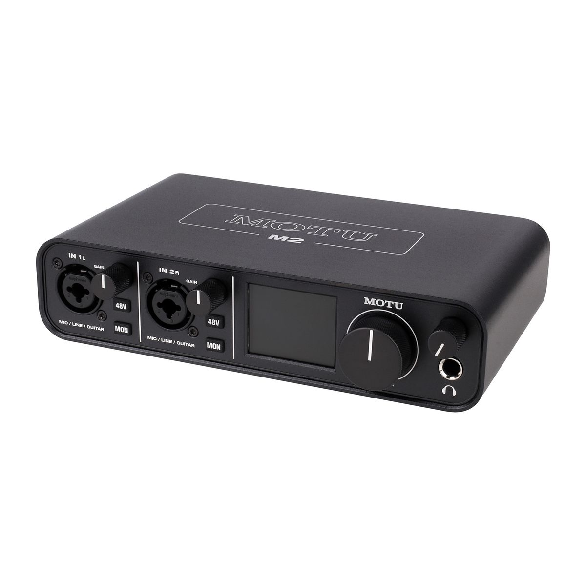 MOTU M2 - компактный аудиоинтерфейс с 2 входами и 2 выходами, с разъемом USB-C для Mac, Windows и iOS. Предназначен для мобильного использования и небольших студий начального уровня. Модель оснащена преобразователем ESS Sabre32 Ultra и имеет динамический диапазон в 120 дБ. Интерфейс поддерживает частоты дискретизации до 192 кГц и обеспечивает низкий уровень звуковой задержки сигнала. На передней панели имеются регуляторы усиления каналов и громкости наушников, кнопки 48V и Mon, ЖК-дисплей с индикацией уровней и общая ручка громкости. Интерфейс оснащен 2 малошумящими предусилителями и обладает функцией прямого мониторинга сигнала, а также режимом Loopback. Имеется два микрофонных / линейных / Hi-Z инструментальных комбинированных входа XLR, индивидуальное предусиление и фантомное питание 48 В, 2 симметричных линейных входа TRS 1/4 дюйма, мониторинг всех входов одним касанием, поддержка стерео-мониторинга, ручка для балансировки входа с воспроизведением на компьютере и выход на наушники с ESS-управлением с независимым регулятором громкости. На задней панели расположены симметричные выходы TRS 1/4 дюйма, несимметричные выходы RCA, вход/выход MIDI, и программные каналы с обратной связью для стриминга и подкастинга. Питание осуществляется по шине USB с выключателем питания (кабель USB входит в комплект). Интерфейс поставляется с программным обеспечением для написания музыки: MOTU Performer Lite и Ableton Live Lite. Также в комплект входит более 100 инструментов, десятки плагинов и более 6 ГБ лупов и сэмплов.