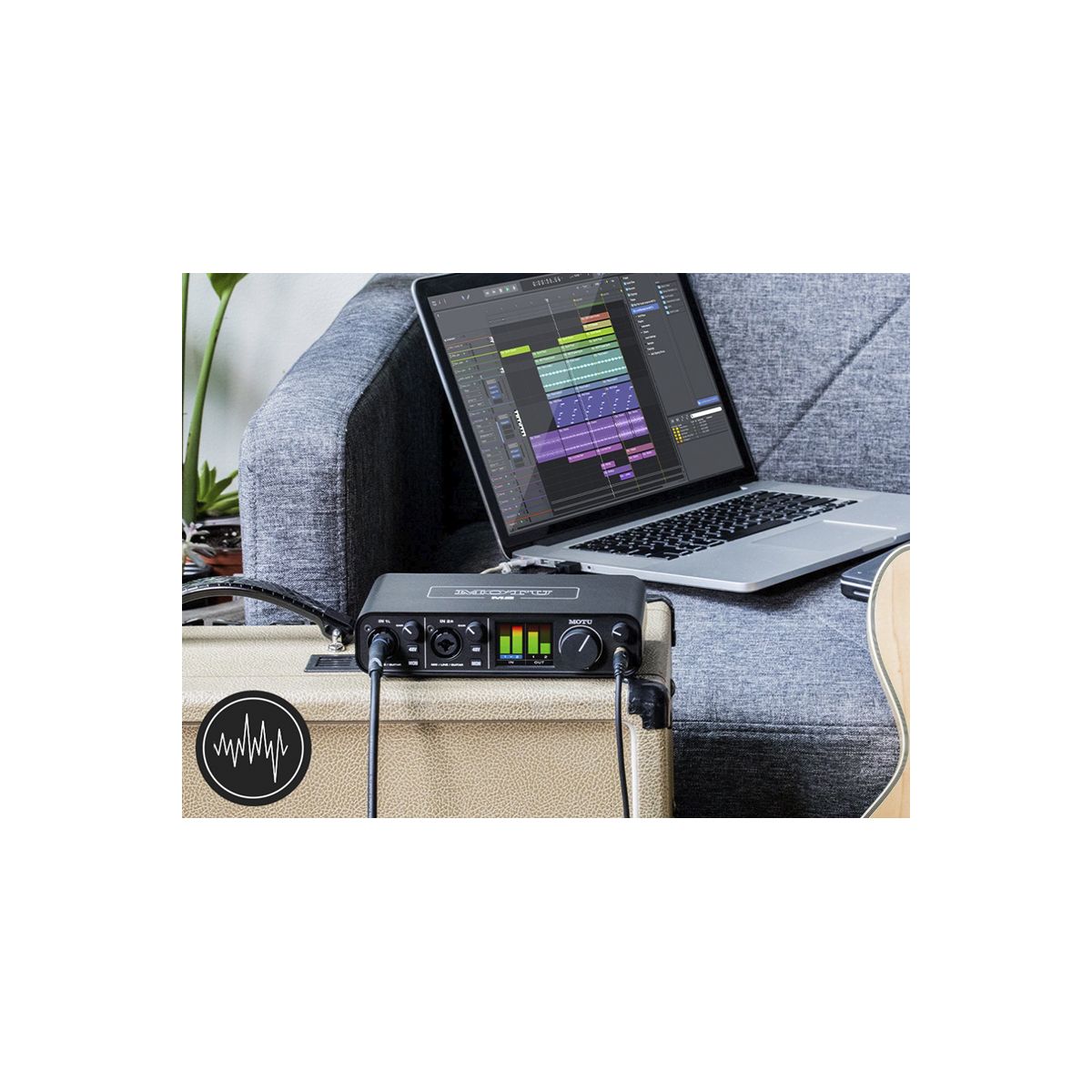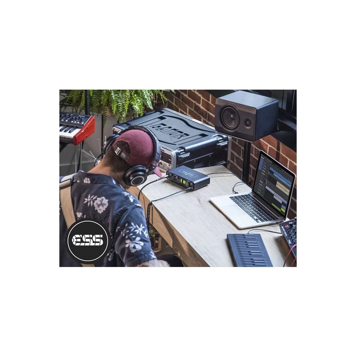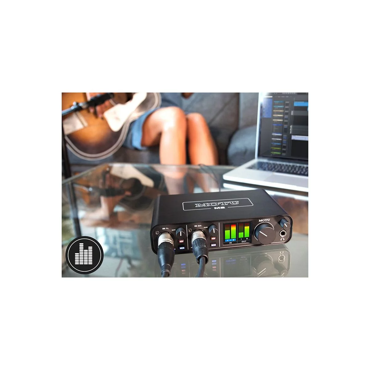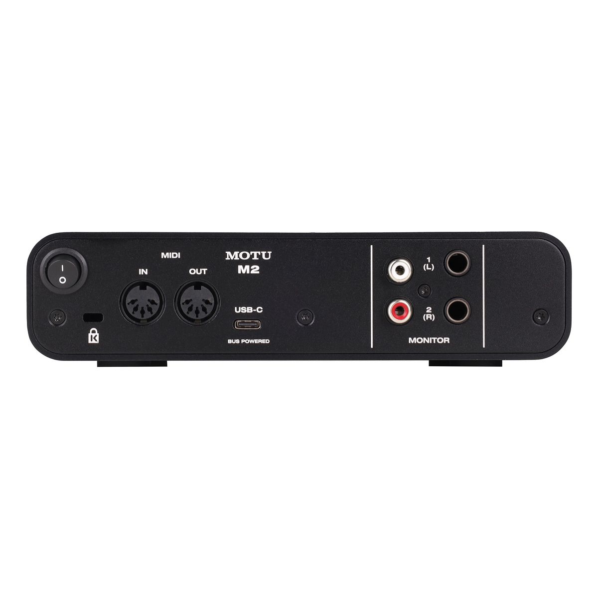 MOTU M2 - компактный аудиоинтерфейс с 2 входами и 2 выходами, с разъемом USB-C для Mac, Windows и iOS. Предназначен для мобильного использования и небольших студий начального уровня. Модель оснащена преобразователем ESS Sabre32 Ultra и имеет динамический диапазон в 120 дБ. Интерфейс поддерживает частоты дискретизации до 192 кГц и обеспечивает низкий уровень звуковой задержки сигнала. На передней панели имеются регуляторы усиления каналов и громкости наушников, кнопки 48V и Mon, ЖК-дисплей с индикацией уровней и общая ручка громкости. Интерфейс оснащен 2 малошумящими предусилителями и обладает функцией прямого мониторинга сигнала, а также режимом Loopback. Имеется два микрофонных / линейных / Hi-Z инструментальных комбинированных входа XLR, индивидуальное предусиление и фантомное питание 48 В, 2 симметричных линейных входа TRS 1/4 дюйма, мониторинг всех входов одним касанием, поддержка стерео-мониторинга, ручка для балансировки входа с воспроизведением на компьютере и выход на наушники с ESS-управлением с независимым регулятором громкости. На задней панели расположены симметричные выходы TRS 1/4 дюйма, несимметричные выходы RCA, вход/выход MIDI, и программные каналы с обратной связью для стриминга и подкастинга. Питание осуществляется по шине USB с выключателем питания (кабель USB входит в комплект). Интерфейс поставляется с программным обеспечением для написания музыки: MOTU Performer Lite и Ableton Live Lite. Также в комплект входит более 100 инструментов, десятки плагинов и более 6 ГБ лупов и сэмплов.