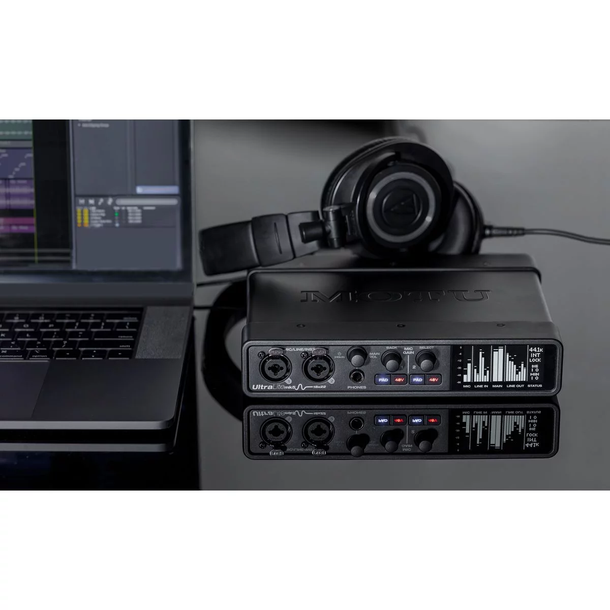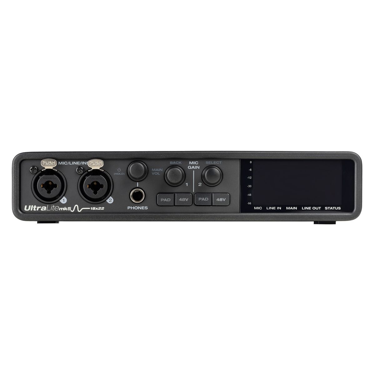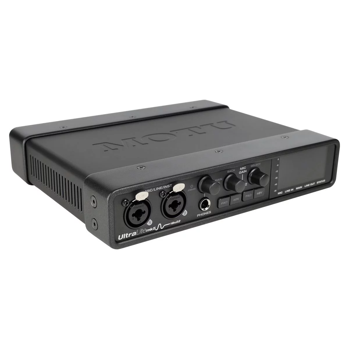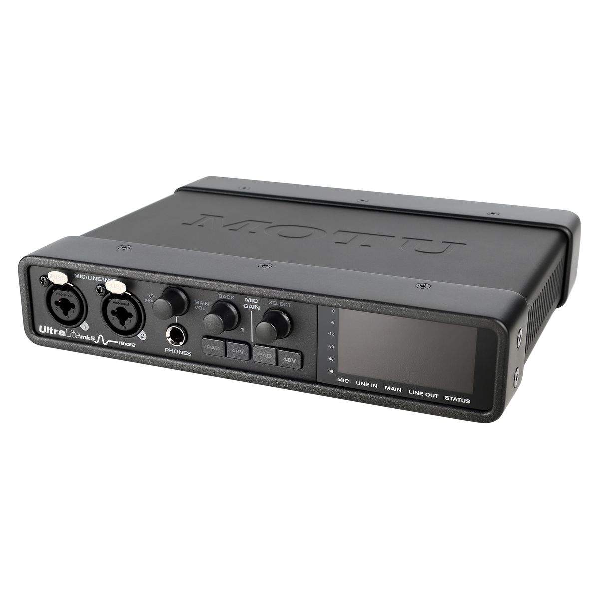 MOTU UltraLite mk5 - профессиональный аудио USB-интерфейс c более мощными АЦП/ЦАП, оптимизированными драйверами и набором DSP эффектов, модель пятого поколения серии UltraLite. Интерфейс оснащен одними из лучших в своем классе преобразователями. В устройстве применен ЦАП ESS Sabre32 ES9026PRO, динамический диапазон которого составляет 125 дБ, а кг+шум равен -114 дБ. Драйвера для интерфейса были переписаны, благодаря чему производителям удалось добиться рекордных показателей звуковой задержки сигнала (2.4 мс при буфере 32 в режиме 96 кГц). UltraLite-Mk5 может одновременно работать с 40 каналами (18/22), обладает DSP процессором со встроенными эффектами, в числе которых эквалайзер, реверб и компрессор, и имеет два микрофонных предусилителя с усилением до 75 дБ. Управление большинством настроек звуковой карты возможно из внешнего приложения CueMix, в котором пользователи могут изменять маршрутизацию каналов, уровни громкости, панораму, а также вызывать эффекты. Для коммутации имеются 2 TRS/XLR входа, 10 TRS выходов, 6 TRS входов, SPDIF In/Out, MIDI In/Out, ADAT In/Out и USB, а также выход для наушников. Питание модели осуществляется от внешнего адаптера. В комплект входит программа Performer Lite и коллекции семплов от Loopmasters и Big Fish Audio.