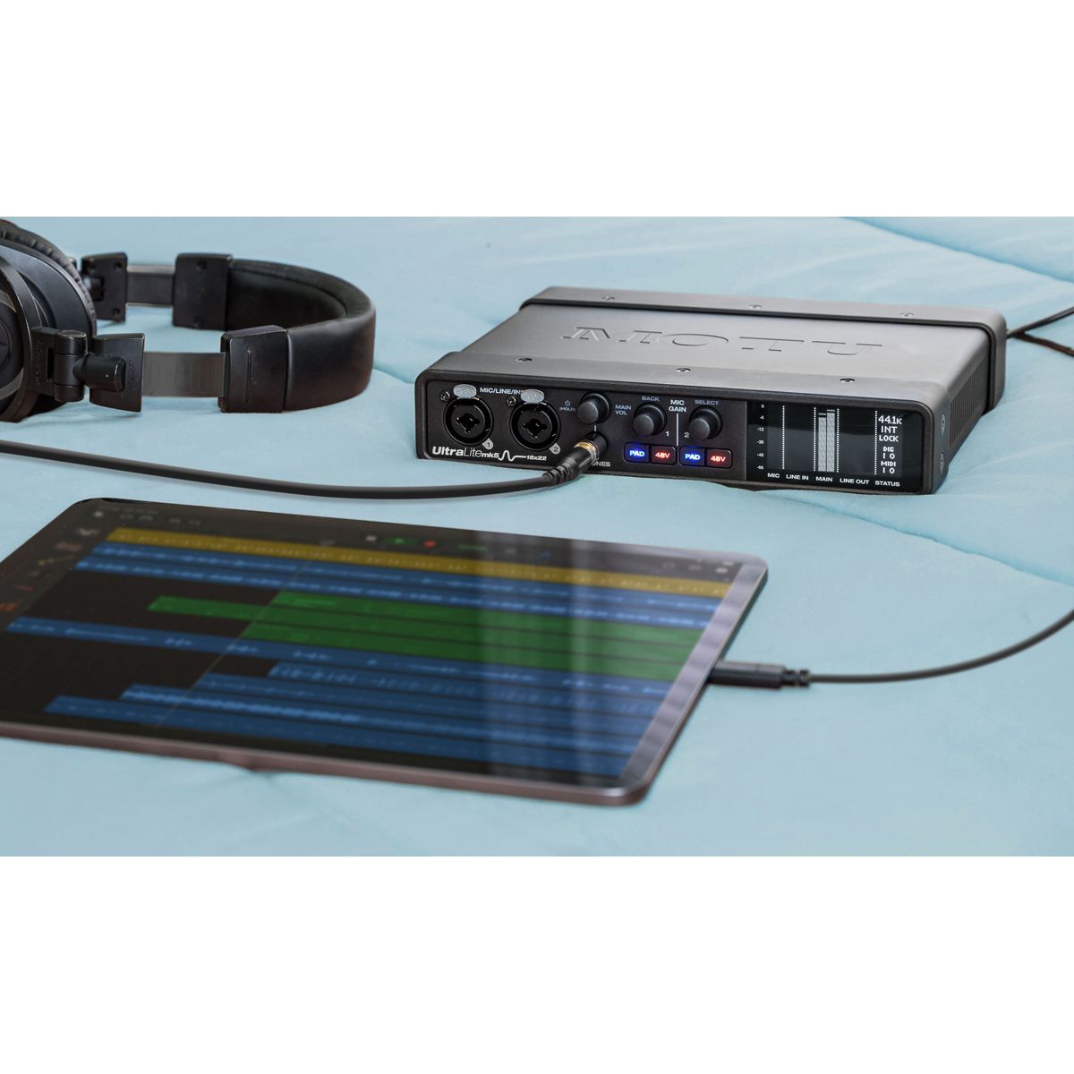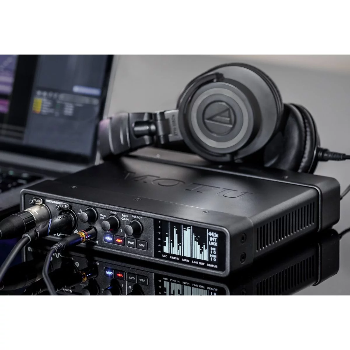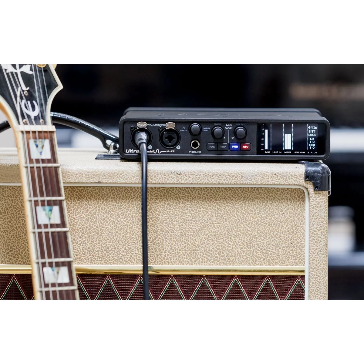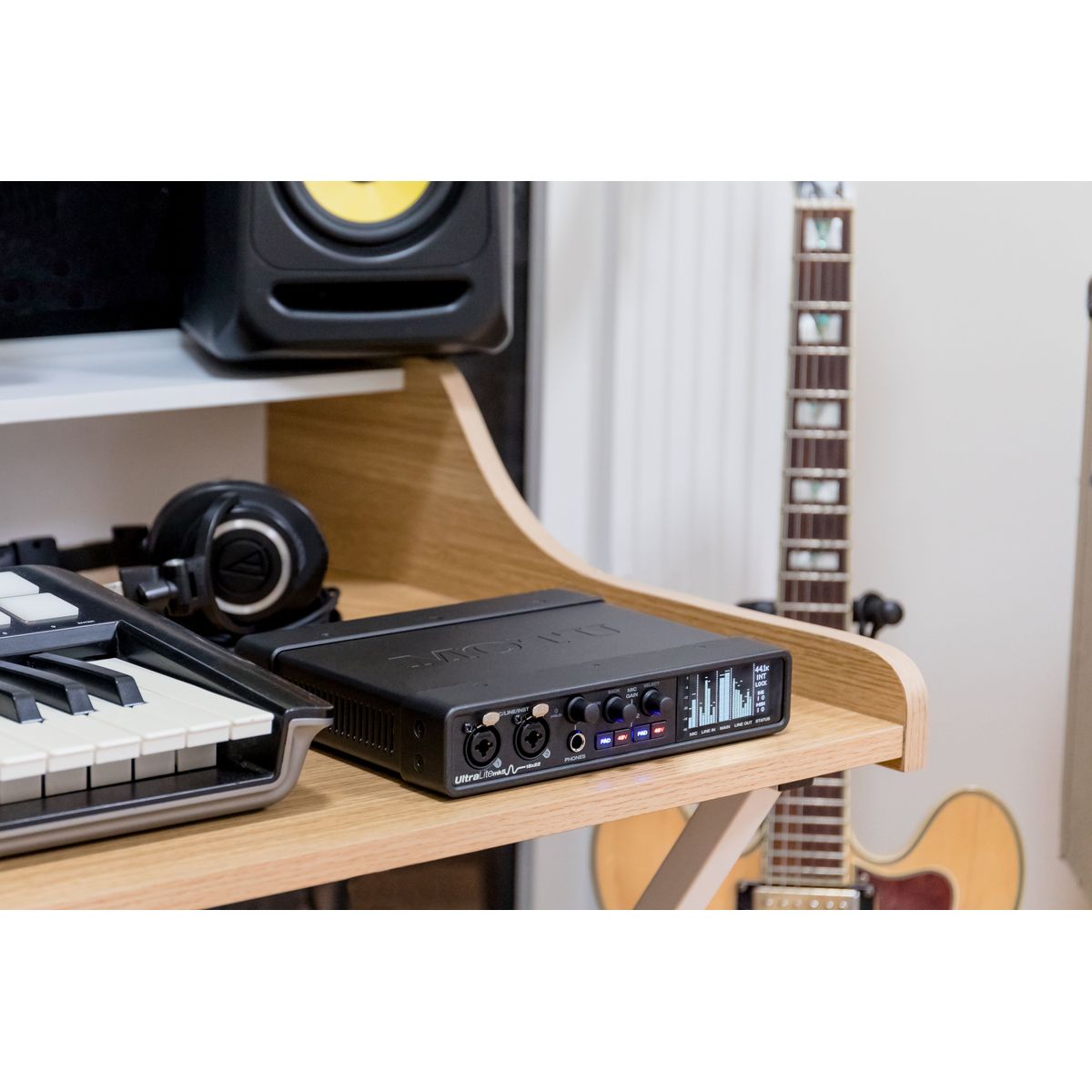 MOTU UltraLite mk5 - профессиональный аудио USB-интерфейс c более мощными АЦП/ЦАП, оптимизированными драйверами и набором DSP эффектов, модель пятого поколения серии UltraLite. Интерфейс оснащен одними из лучших в своем классе преобразователями. В устройстве применен ЦАП ESS Sabre32 ES9026PRO, динамический диапазон которого составляет 125 дБ, а кг+шум равен -114 дБ. Драйвера для интерфейса были переписаны, благодаря чему производителям удалось добиться рекордных показателей звуковой задержки сигнала (2.4 мс при буфере 32 в режиме 96 кГц). UltraLite-Mk5 может одновременно работать с 40 каналами (18/22), обладает DSP процессором со встроенными эффектами, в числе которых эквалайзер, реверб и компрессор, и имеет два микрофонных предусилителя с усилением до 75 дБ. Управление большинством настроек звуковой карты возможно из внешнего приложения CueMix, в котором пользователи могут изменять маршрутизацию каналов, уровни громкости, панораму, а также вызывать эффекты. Для коммутации имеются 2 TRS/XLR входа, 10 TRS выходов, 6 TRS входов, SPDIF In/Out, MIDI In/Out, ADAT In/Out и USB, а также выход для наушников. Питание модели осуществляется от внешнего адаптера. В комплект входит программа Performer Lite и коллекции семплов от Loopmasters и Big Fish Audio.