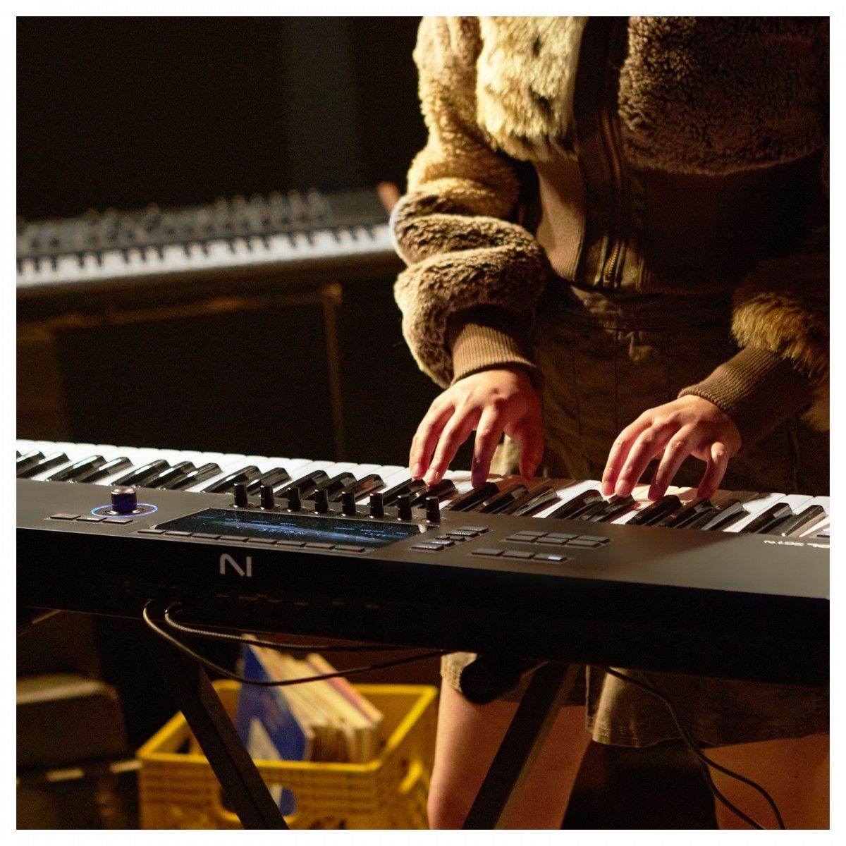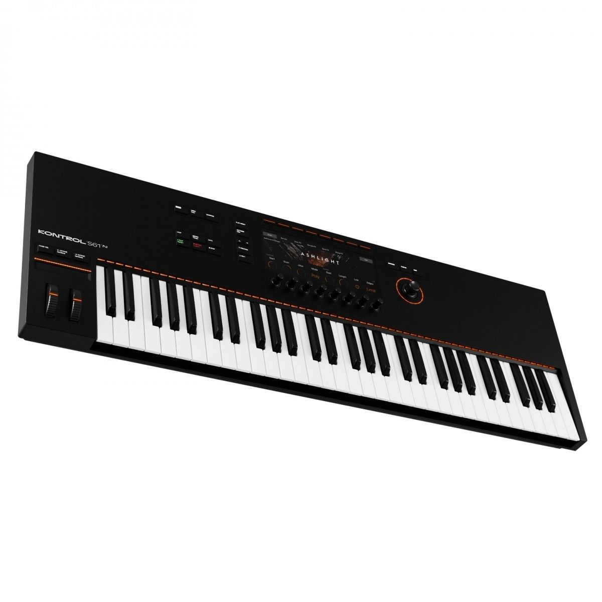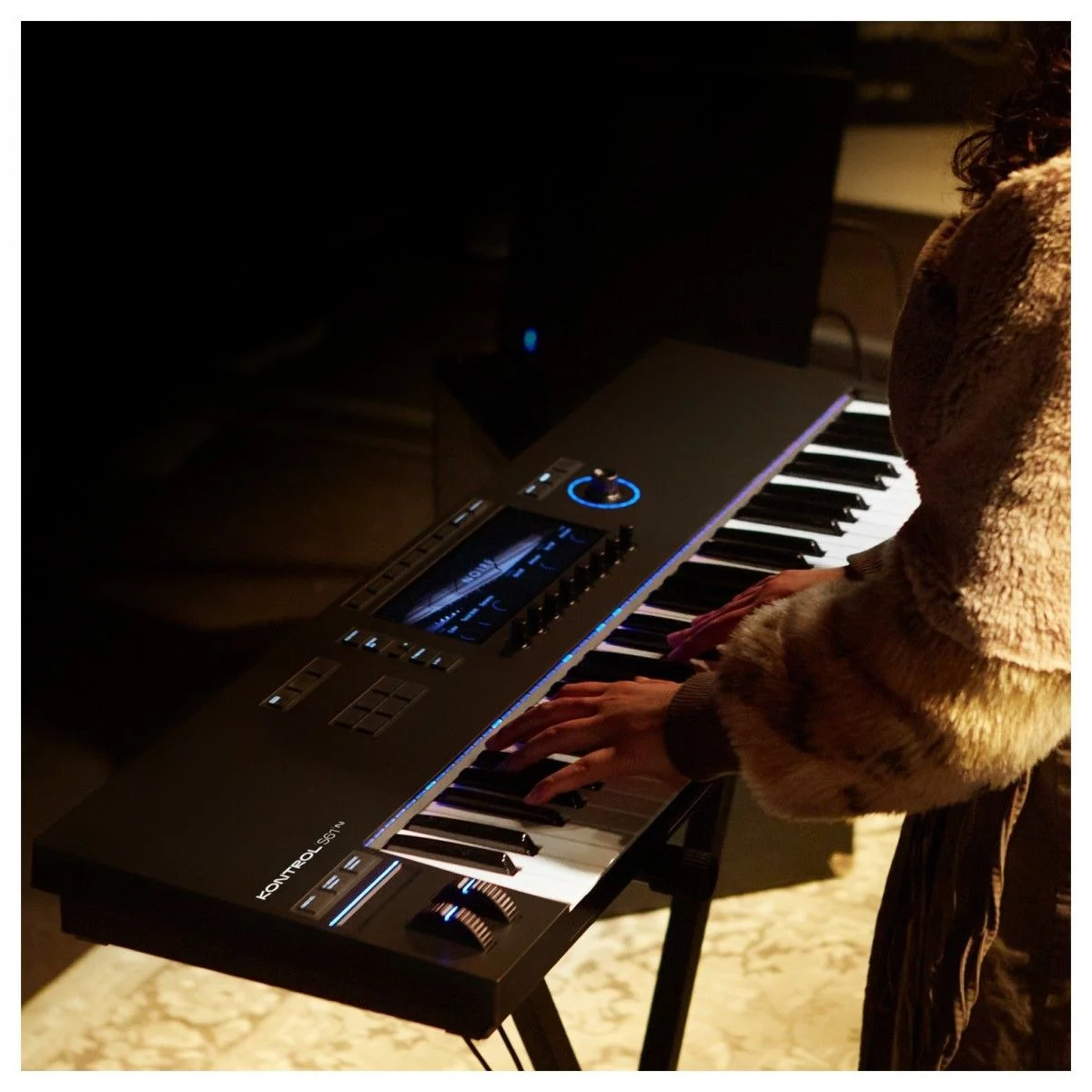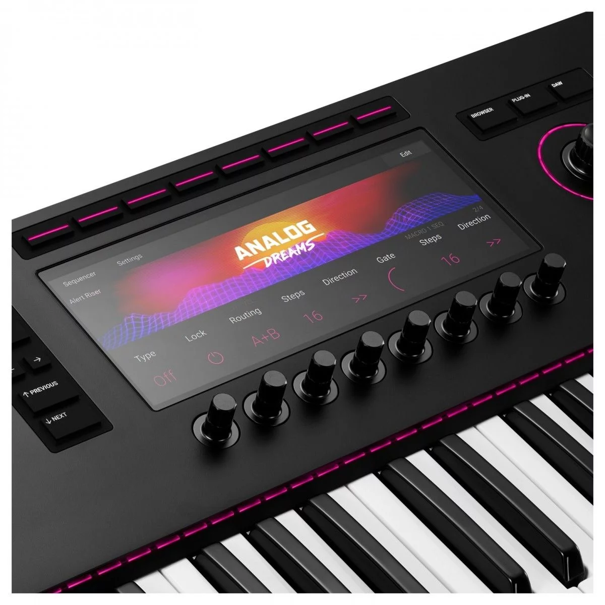 Native Instruments Komplete Kontrol S61 Mk3 - 61-клавишный MIDI-контроллер с полувзвешенной клавиатурой Fatar с полифоническим послекасанием. Модель оснащена цельным корпусом, а также имеет RGB-подсветку над каждой клавишей с отображением разделенных зон/сигнальных ячеек и один крупный цветной экран высокого разрешения со стеклянной поверхностью и разрешением 1280 x 480. Кроме этого, предусмотрены колёса Pitch/Mod из обработанного металла, 8 алюминиевых нажимных энкодеров, крупный регулятор с подсветкой для настроек и функциональные кнопки. Коммутационные возможности представляют из себя порт USB-C (с питанием от шины), разъёмы MIDI I/O, разъёмы под педали сустейна/экспресии и два назначаемых входа для педалей. Стандарт NKS теперь обеспечивает еще более глубокий контроль над NI Komplete и другими совместимыми инструментами. Пользователи смогут просматривать библиотеки пресетов прямо на клавиатуре. На экране отображаются фактические названия параметров вместе с соответствующими элементами управления, а также предоставляется выбор между оптимизированным режимом (лёгкий доступ к наиболее важным параметрам для настройки) и режимом редактирования с несколькими страницами параметров для углубленного редактирования. Модель поставляется с пакетом программного обеспечения, включающим Komplete 14 Select/Kontrol, Stradivari Cello, Hypha, Guitar Rig LE, iZotope Elements Suite и Ableton Live Lite.
