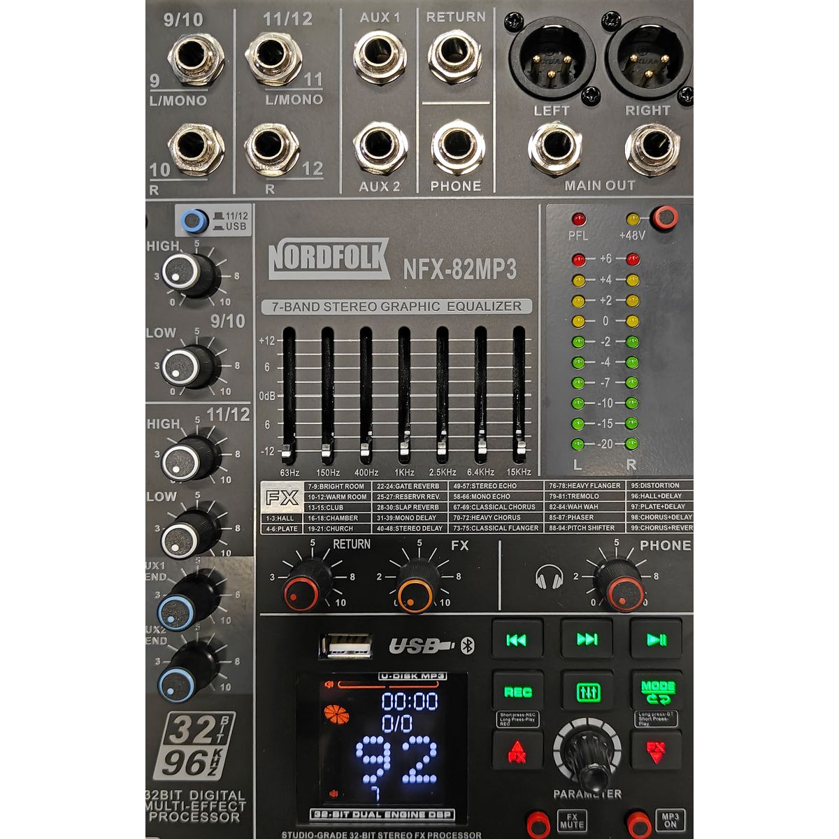 Имеет 8 каналов с входами ComboXLR, который позволяет подключить как балансный микрофонный кабель, так и гитарный инструментальный 6,3 Jack и