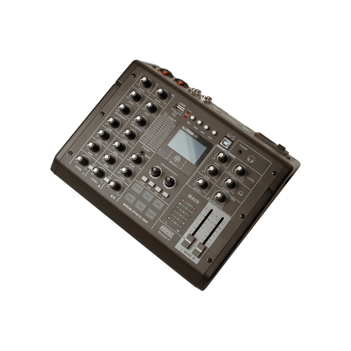 Встроенный DSP процессор с блоком отдельных звуковых спецэффектов и MP3 проигрыватель с входом USB и возможностью записи.