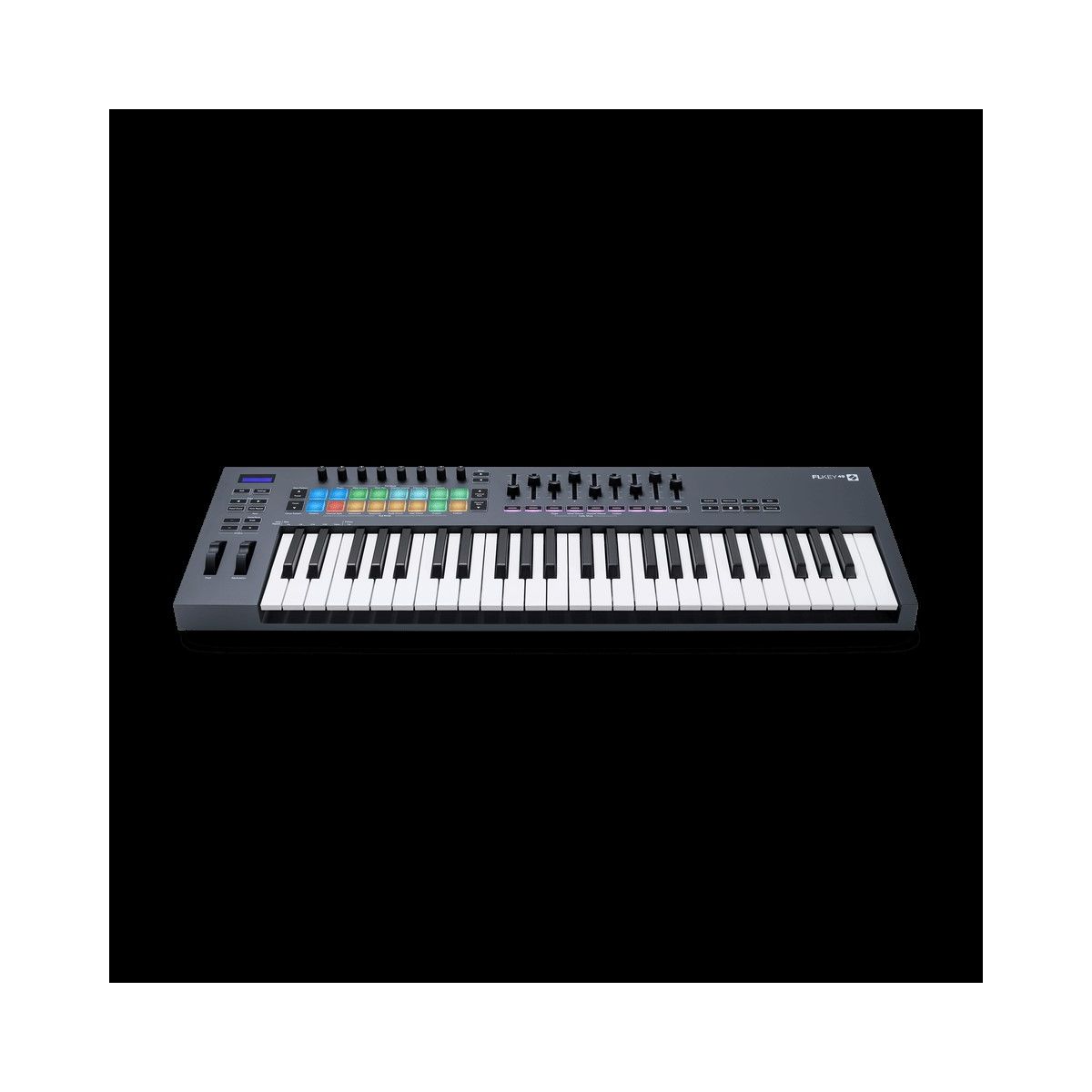 Благодаря 49 клавишам, 16 чувствительным к силе нажатия пэдам, девяти 45-миллиметровым фейдерам, восьми настраиваемым регуляторам и основным элементам управления воспроизведением, FLkey 49 размещает все необходимое именно там, где вам нужно, — чтобы вы могли оставаться в ритме.