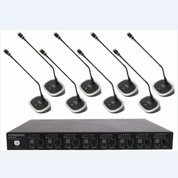 Передатчики выполнены ввиде настольных конференционных микрофонов типа "гусиная шея", состоящих из устойчивого металлического основания и съемного микрофона "гусиная шея" длиной 30 см.
