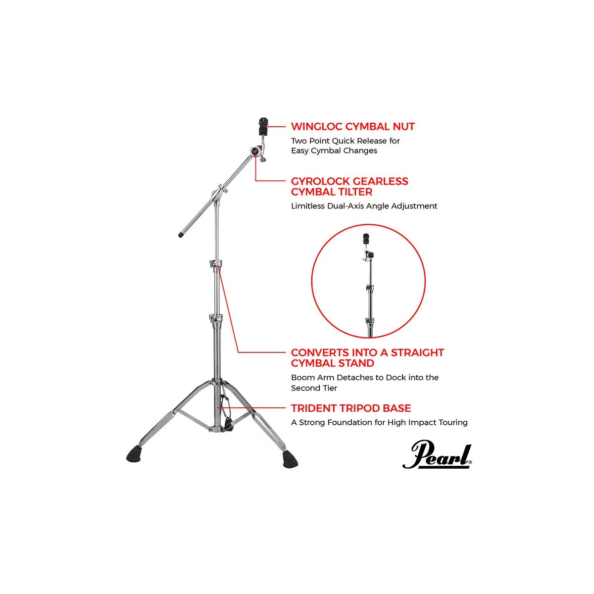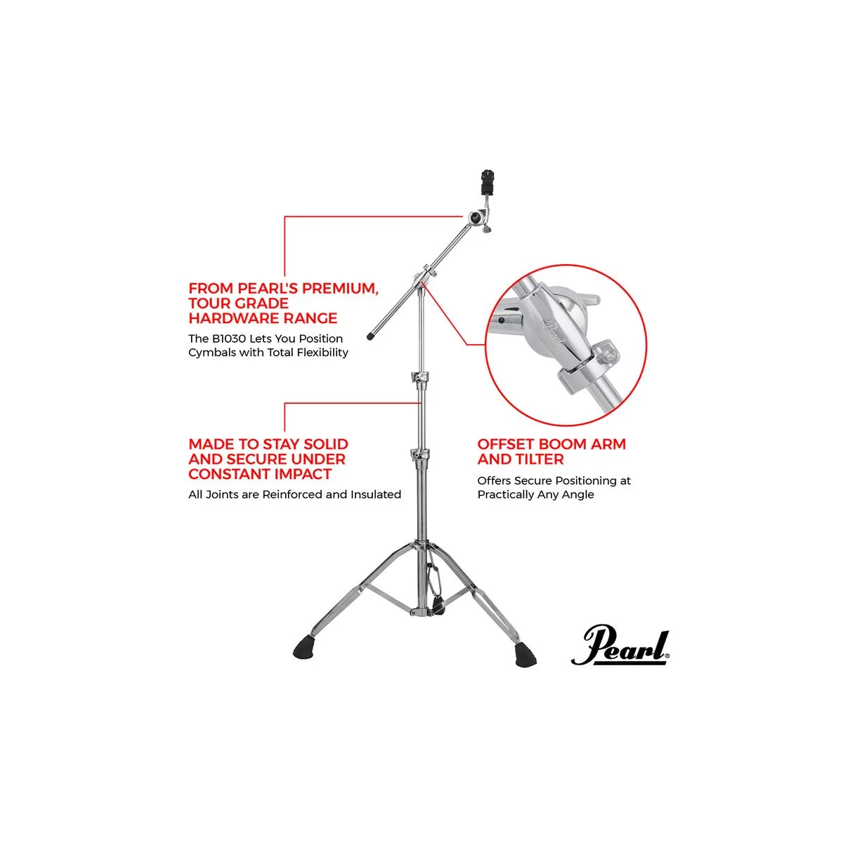 Если вы серьёзно относитесь к игре на барабанах, отнеситесь серьёзно и к своему оборудованию. Стойка B-1030 надёжна и готова к постоянным сборкам-разборкам, транпортировкам, выступлениям и занятиям. Стойка B-1030 имеет трёхсекционную телескопическую конструкцию и прочную трубчатую стрелу с литым поворотным зажимом. Литые зажимные узлы секций оснащены нейлоновыми втулками для предотвращения нежелательных вибрационных шумов внутри. Двойные ножки с вибропоглощающими резиновыми насадками обеспечивают надёжную опору.